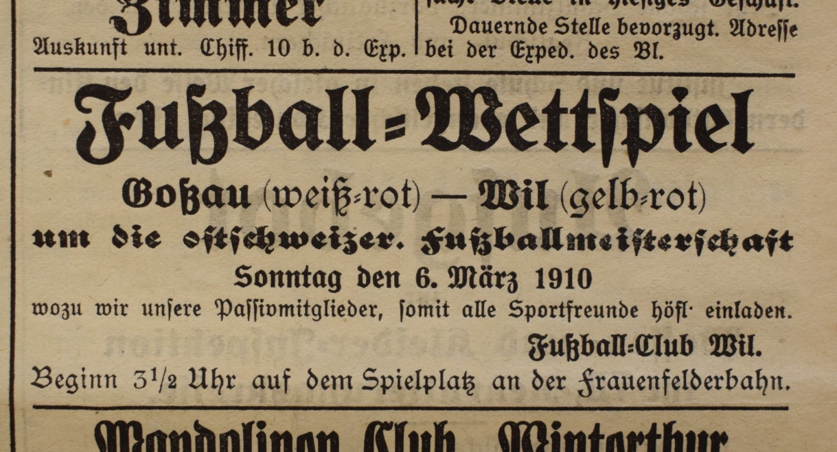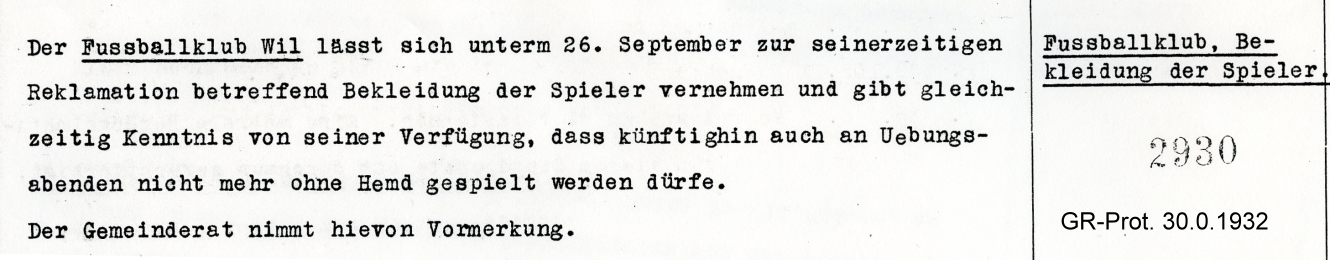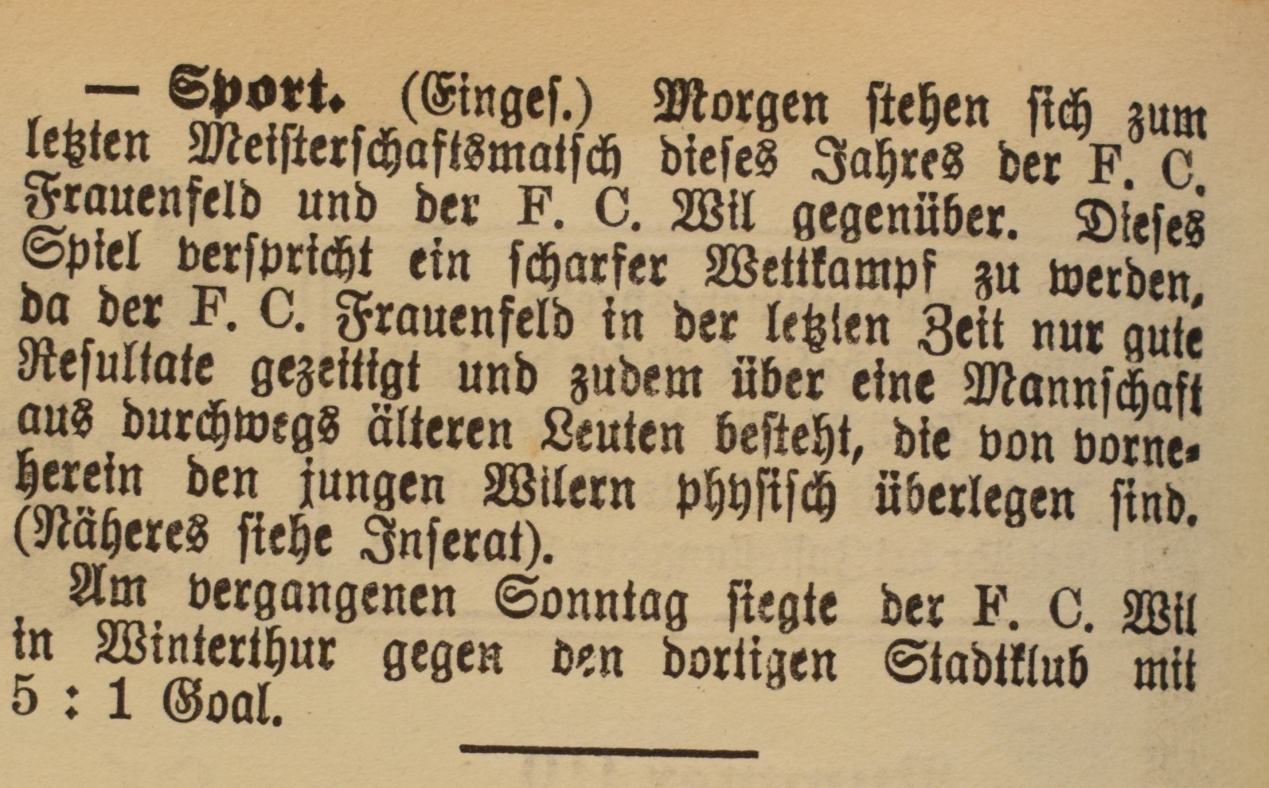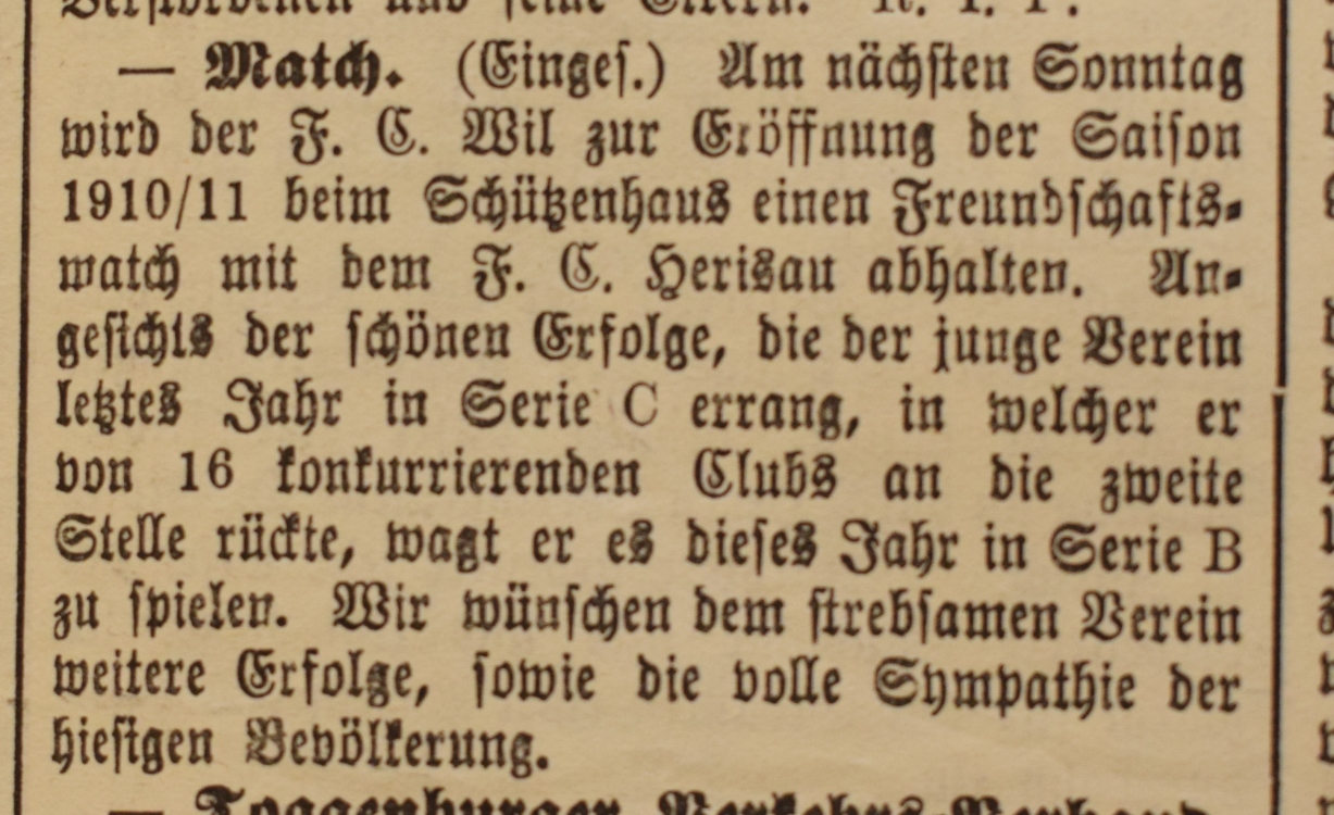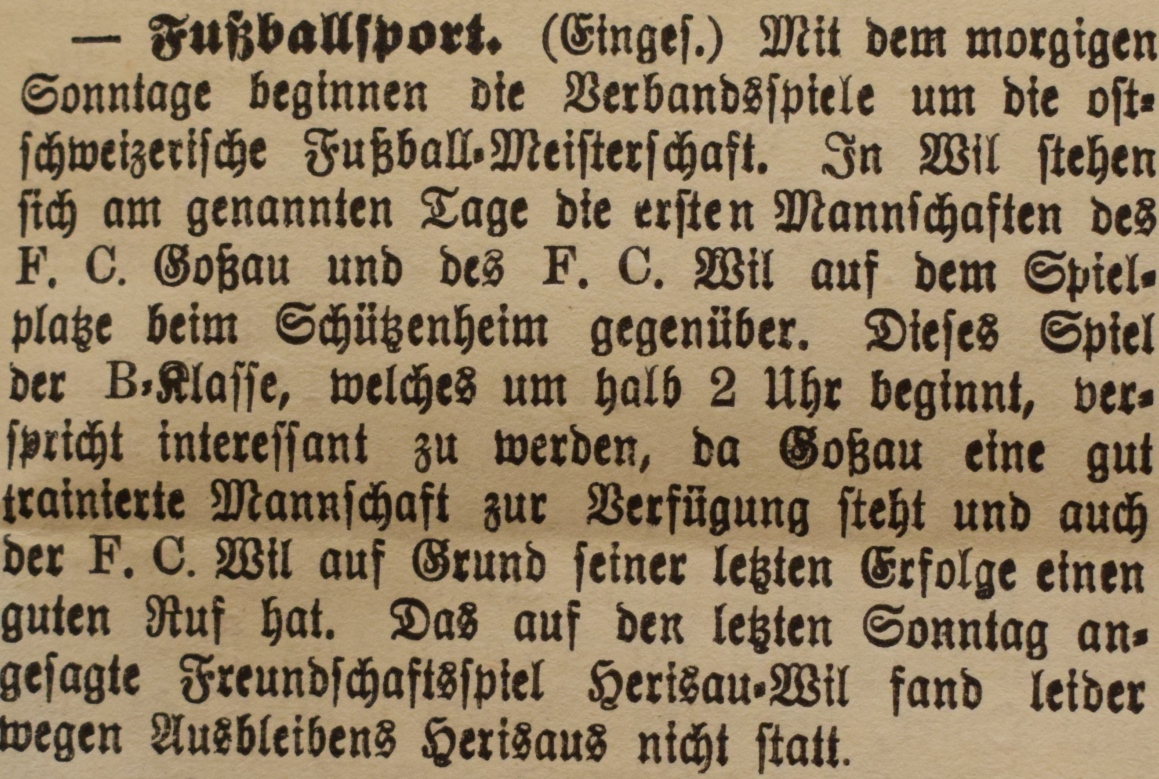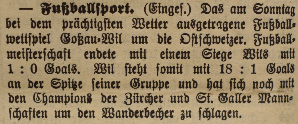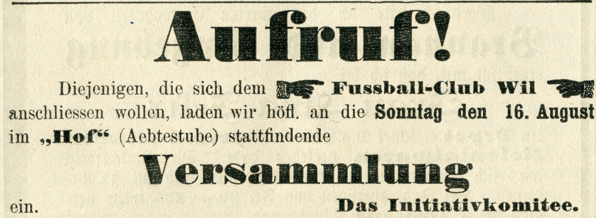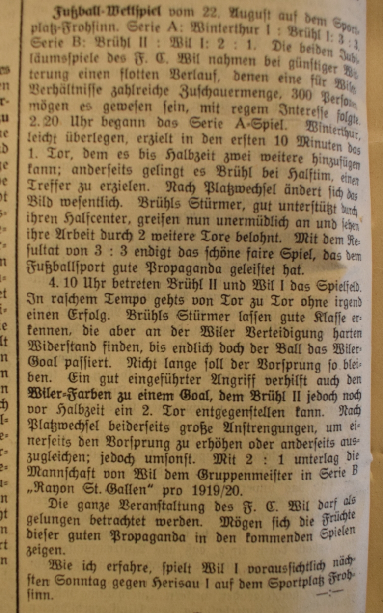 1900: Gründung des Vereins als FC Stella (noch nicht belegt !) 1902: Namensänderung in FC Fors (noch nicht belegt !) 1903: Gründung des FC Wil 1914–1918: Kein bzw. nur vereinzelt Spielbetrieb 1920: Wiederaufnahme Wettspielbetrieb 1935: Projekt Tribüne 1937: Gruppenmeister Junioren