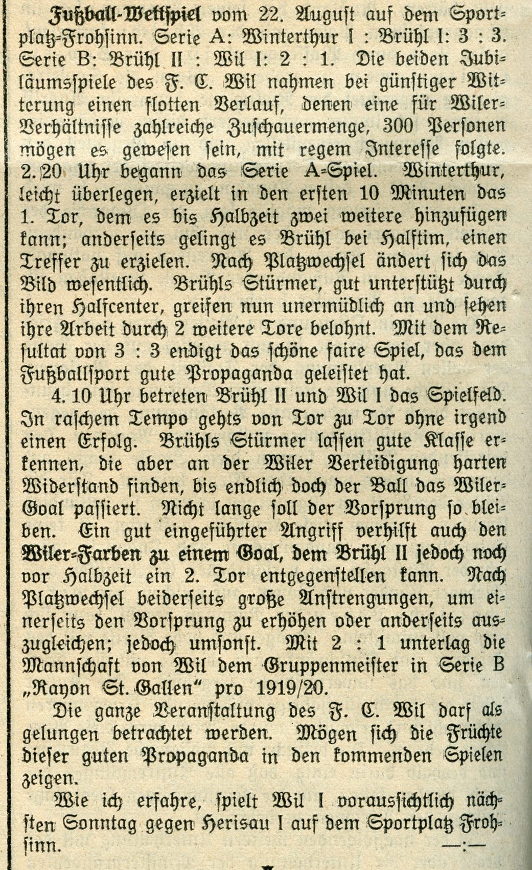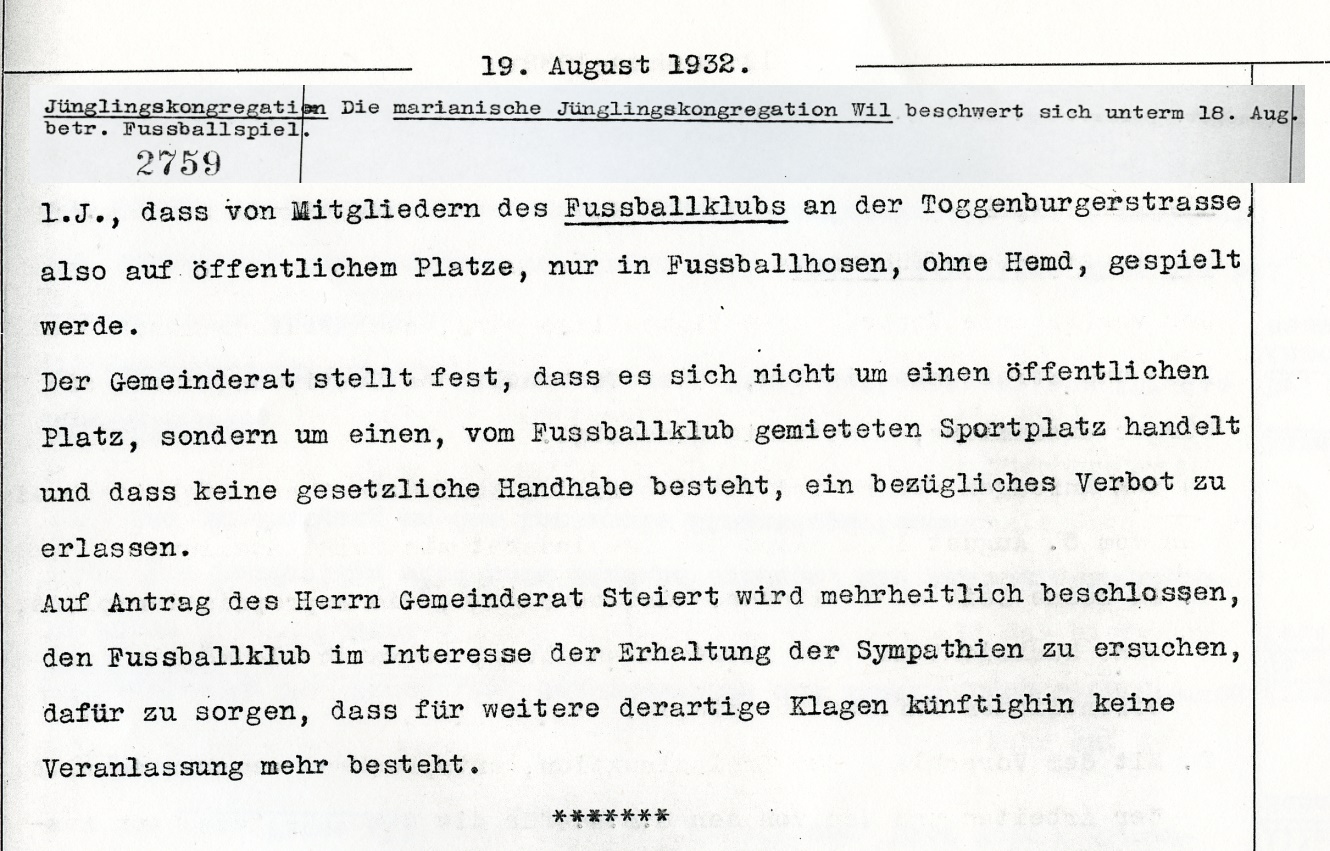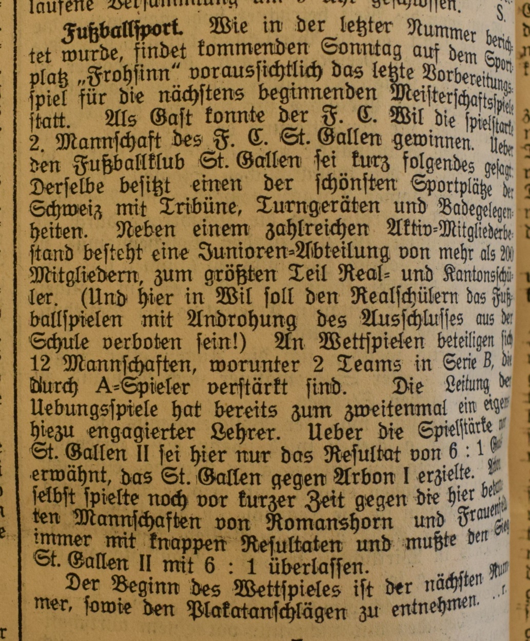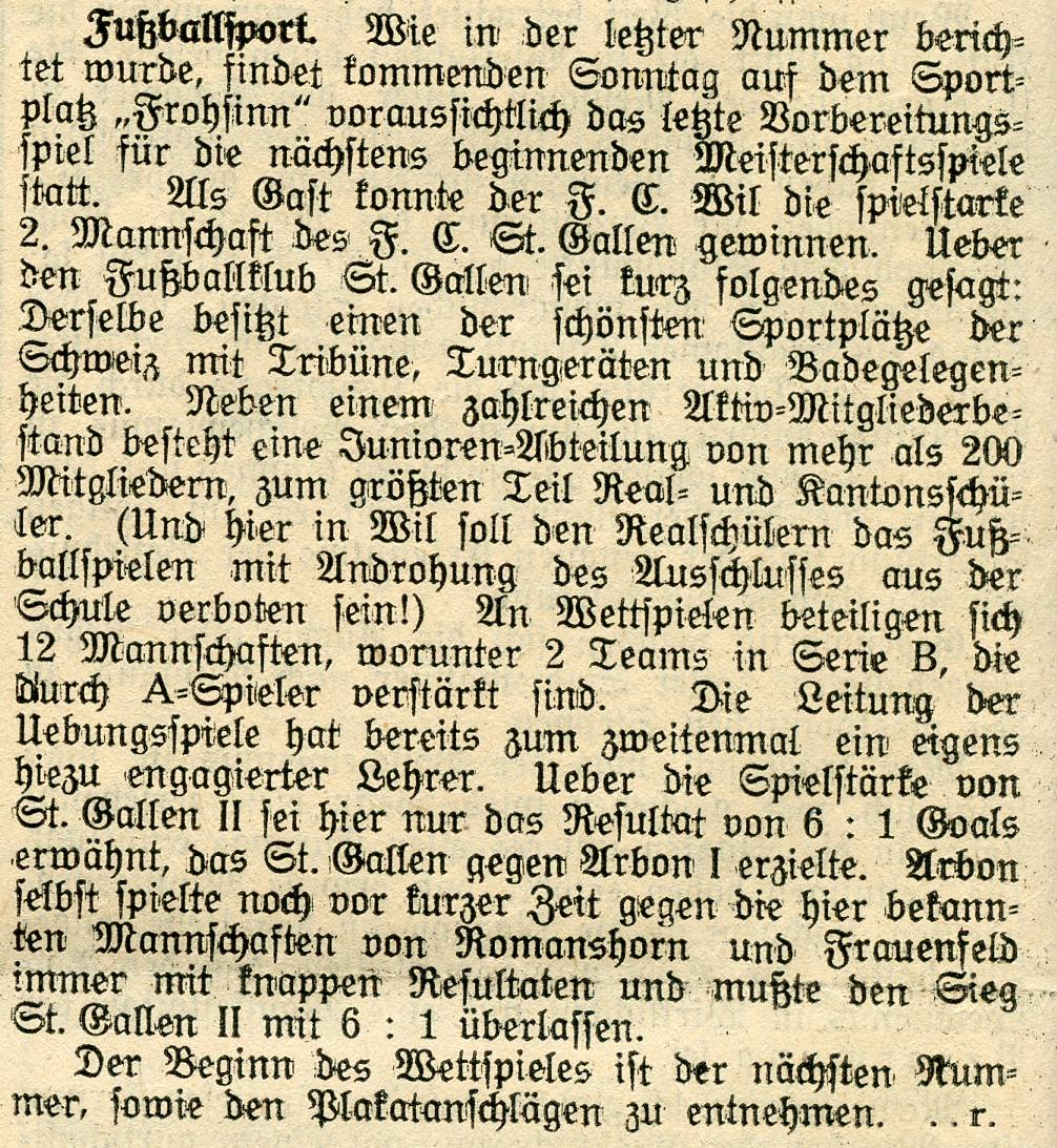1900: Gründung des Vereins als FC Stella (noch nicht belegt !) 1902: Namensänderung in FC Fors (noch nicht belegt !) 1903: Gründung des FC Wil 1914–1918: Kein bzw. nur vereinzelt Spielbetrieb 1920: Wiederaufnahme Wettspielbetrieb 1935: Projekt Tribüne 1937: Gruppenmeister Junioren