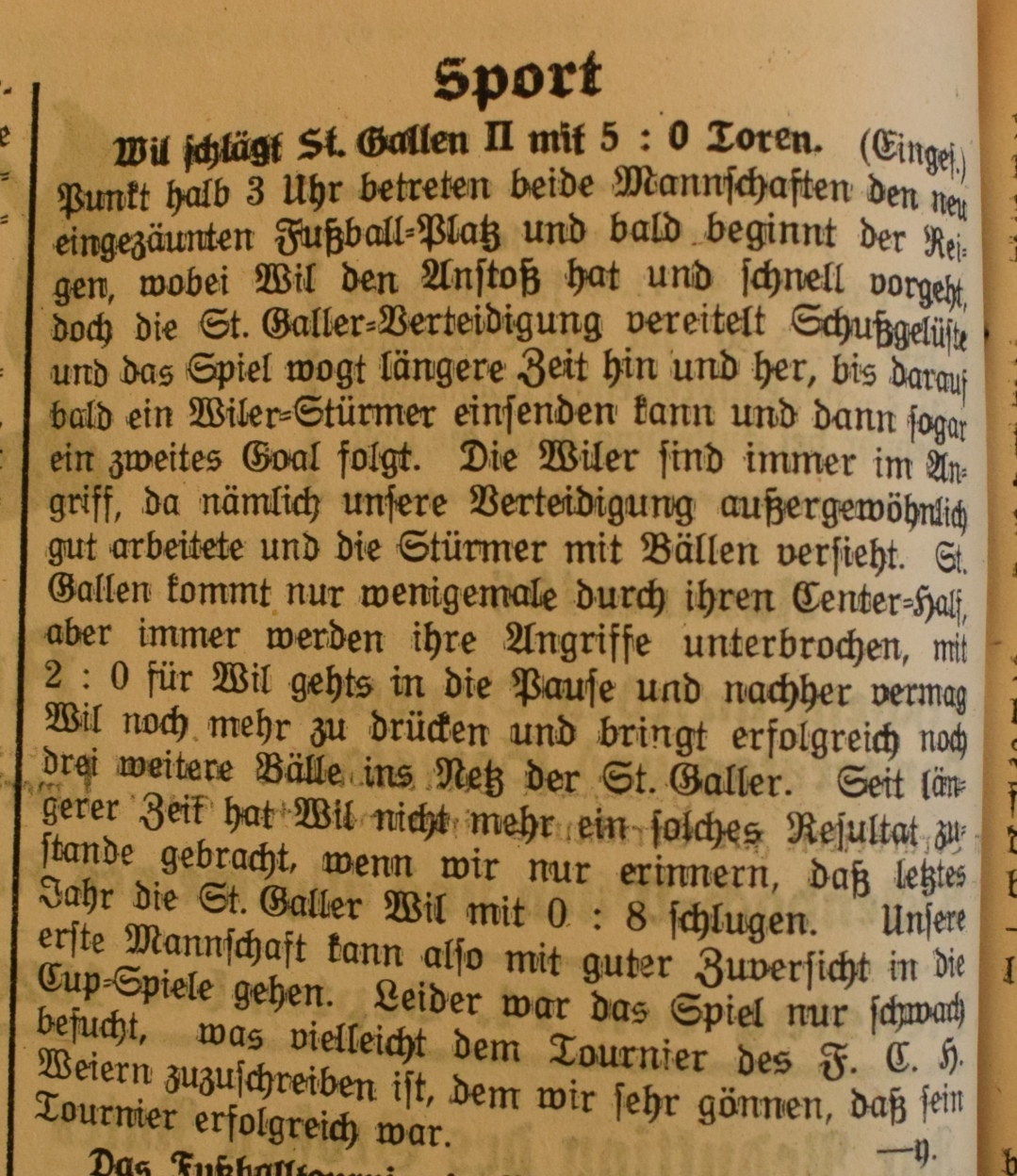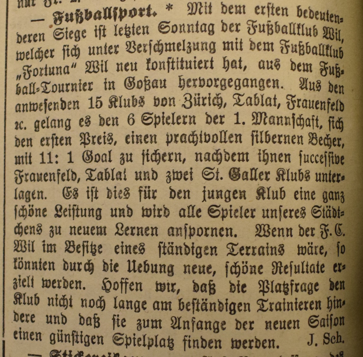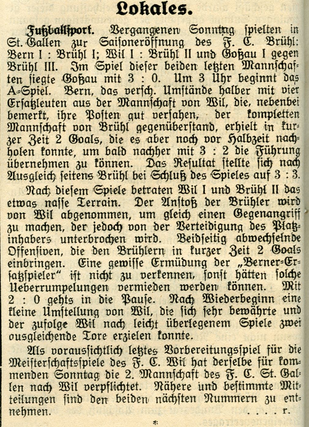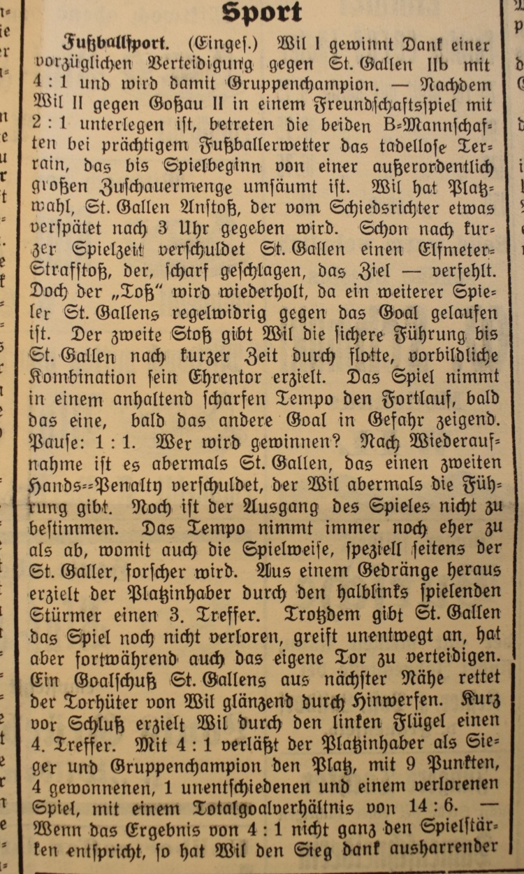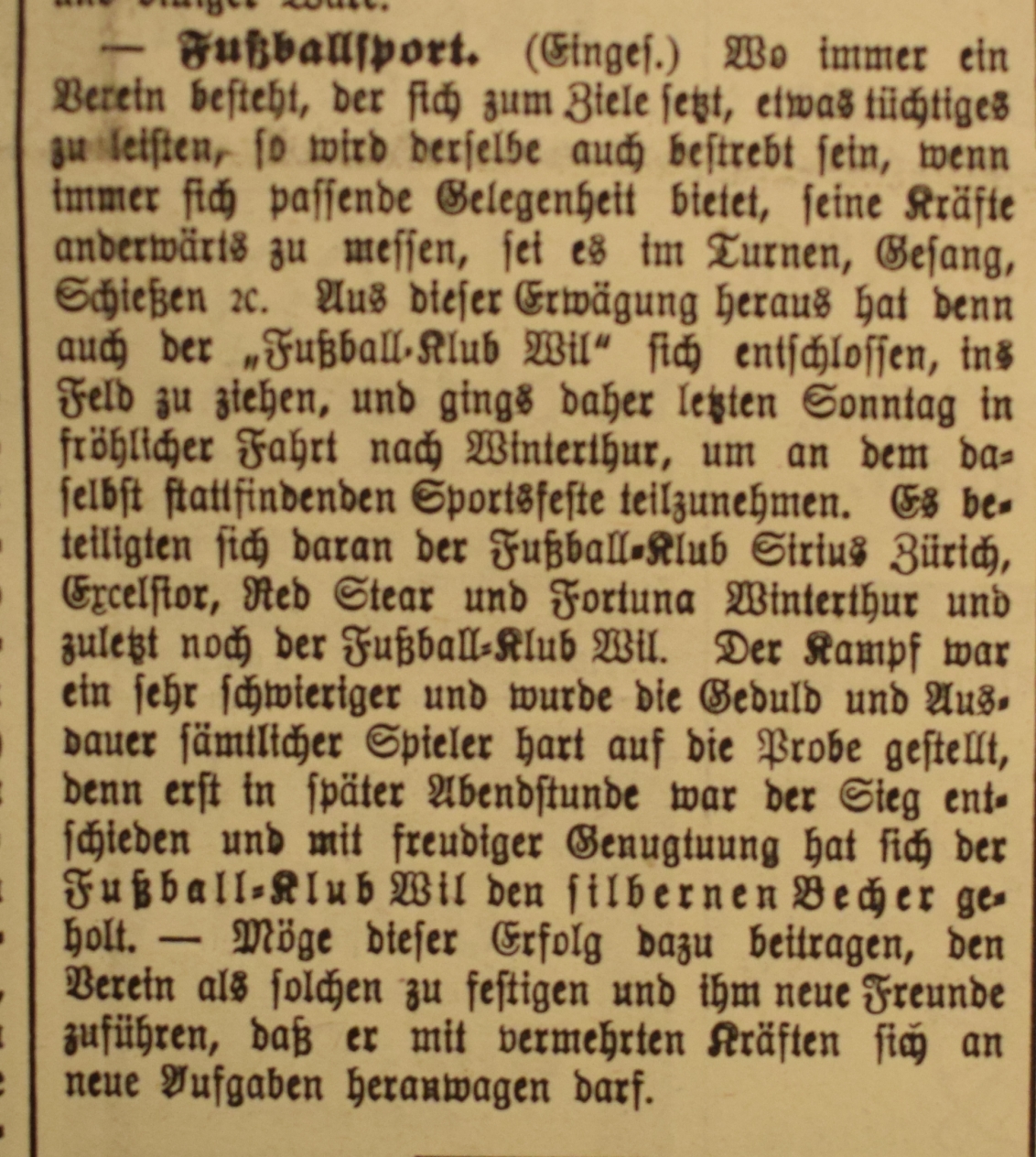 1900: Gründung des Vereins als FC Stella (noch nicht belegt !) 1902: Namensänderung in FC Fors (noch nicht belegt !) 1903: Gründung des FC Wil 1914–1918: Kein bzw. nur vereinzelt Spielbetrieb 1920: Wiederaufnahme Wettspielbetrieb 1935: Projekt Tribüne 1937: Gruppenmeister Junioren