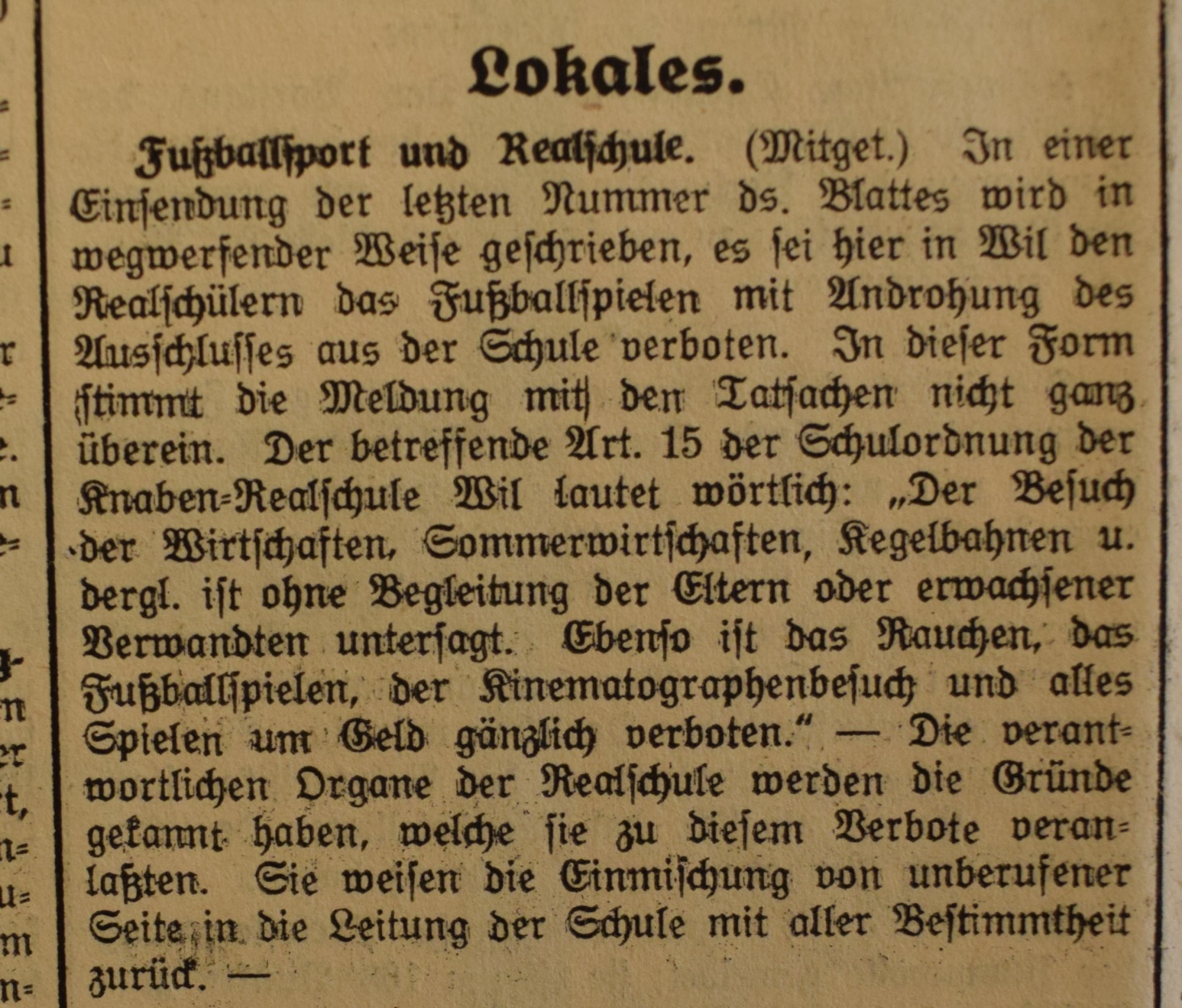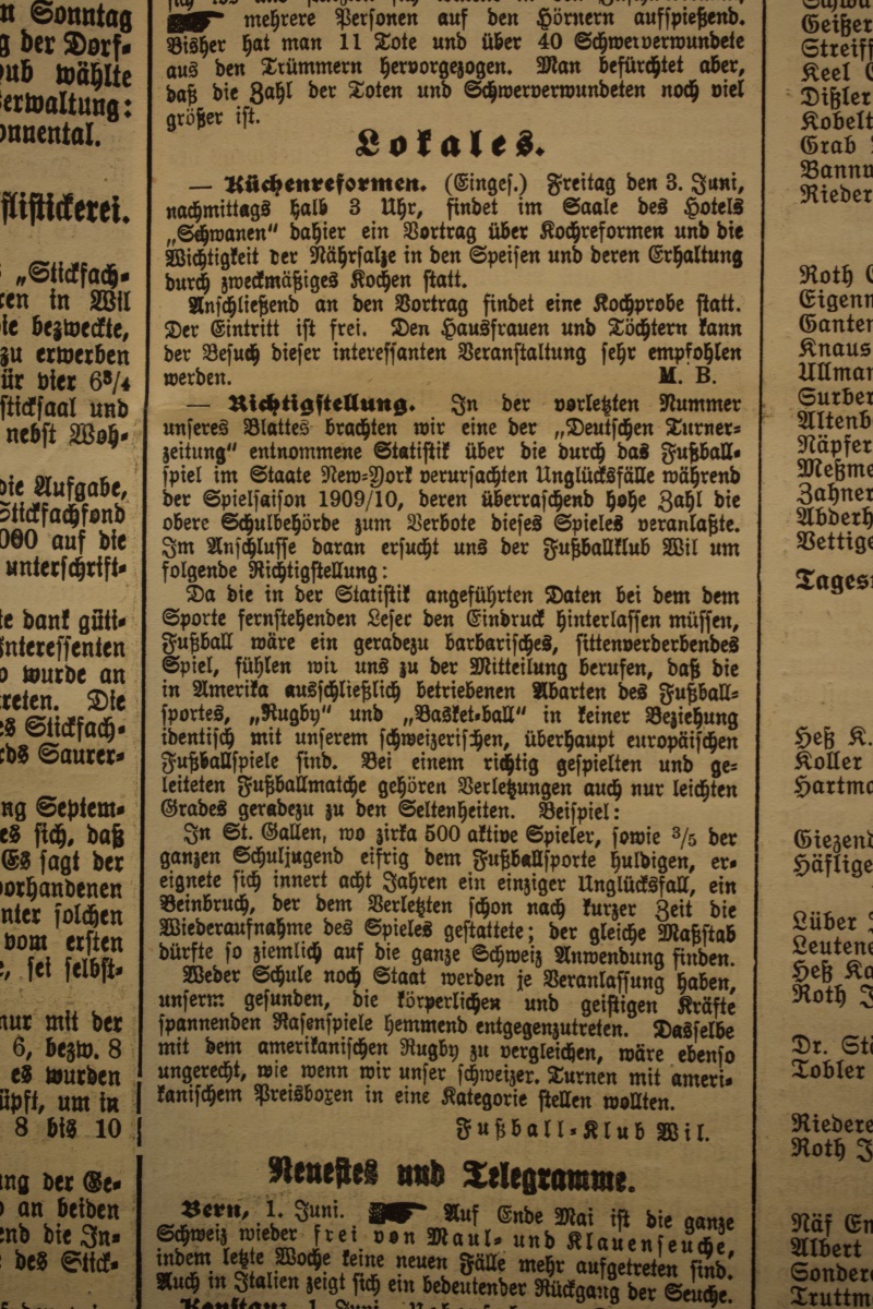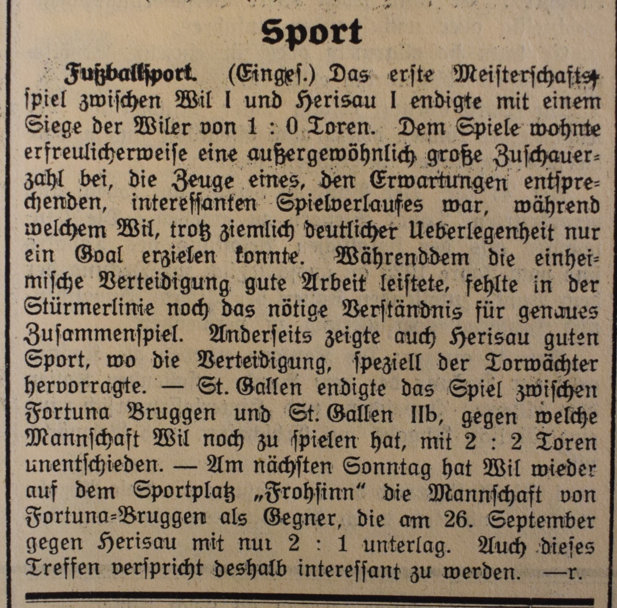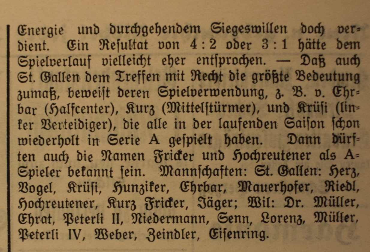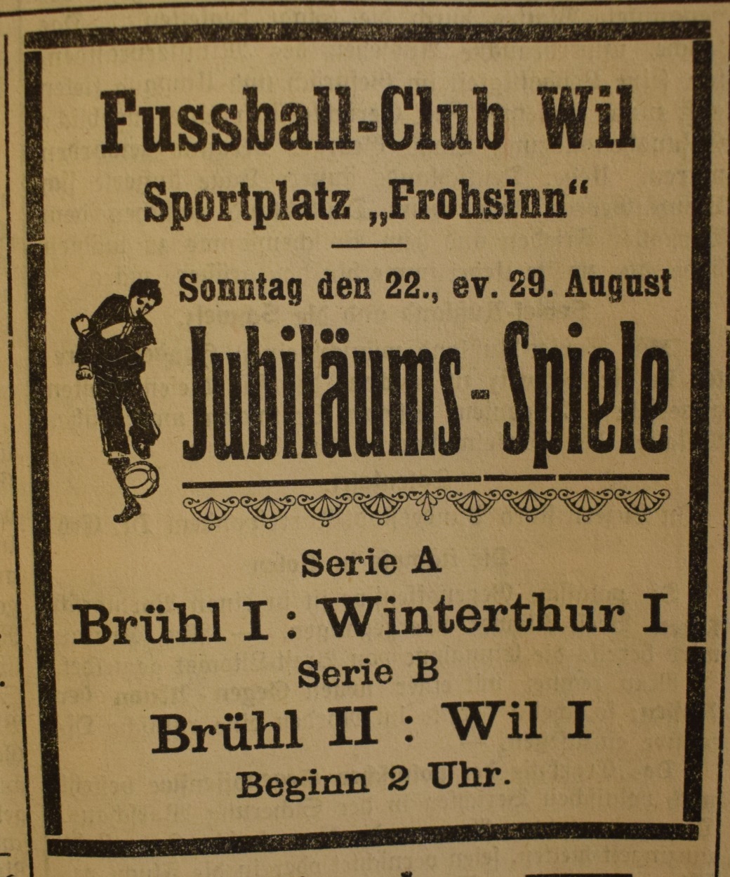 1900: Gründung des Vereins als FC Stella (noch nicht belegt !) 1902: Namensänderung in FC Fors (noch nicht belegt !) 1903: Gründung des FC Wil 1914–1918: Kein bzw. nur vereinzelt Spielbetrieb 1920: Wiederaufnahme Wettspielbetrieb 1935: Projekt Tribüne 1937: Gruppenmeister Junioren