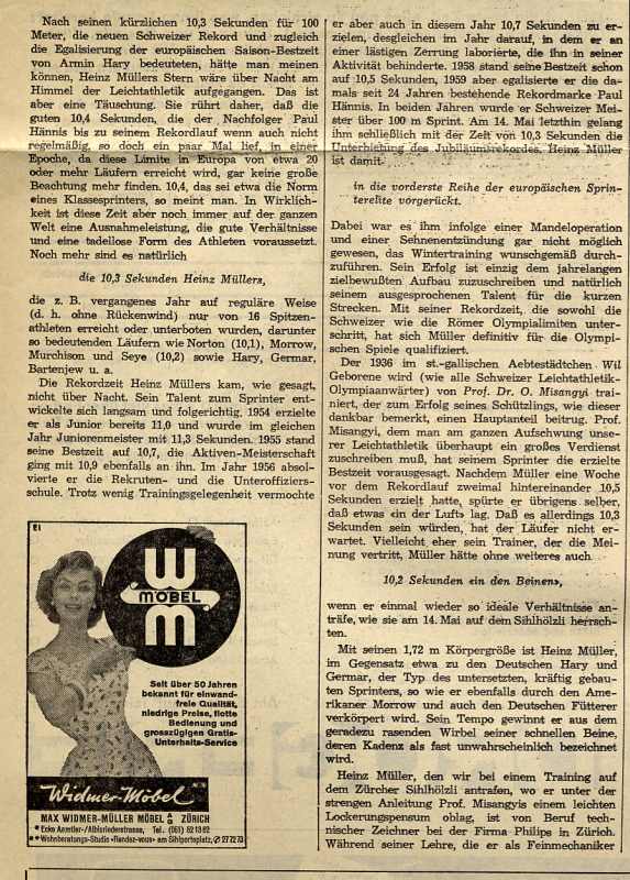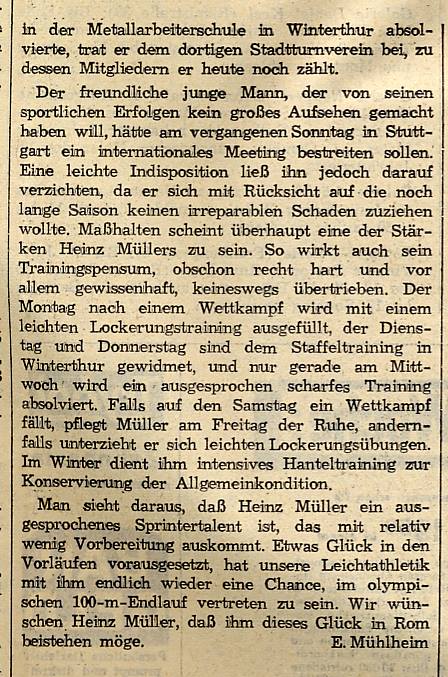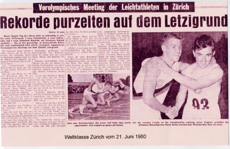 Am 14. Mai 1960 lief er im Zürcher Letzigrund eine Zeit von 10,3 Sekunden, die nicht nur Schweizer Rekord war, sondern ihn auch für die Olympischen Spiele in Rom qualifizierte. Legendär wurde das Rennen darum, da der erste Lauf annulliert wurde - und Heinz Müller zusammen mit dem Deutschen Jürgen Schüttler auf Bitten von Armin Hary nochmals antrat - worauf Hary mit 10,0 einen neuen Weltrekord einstellte.