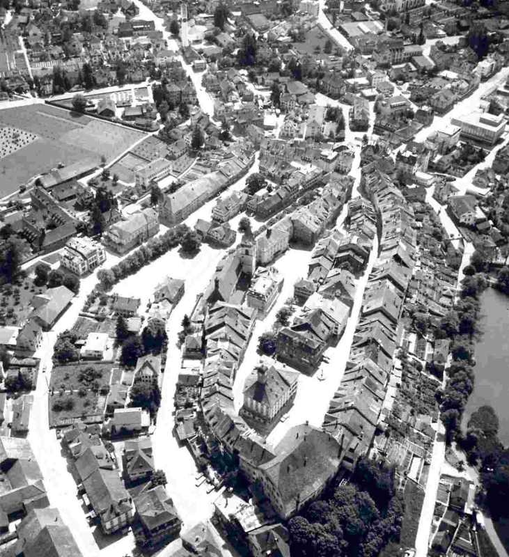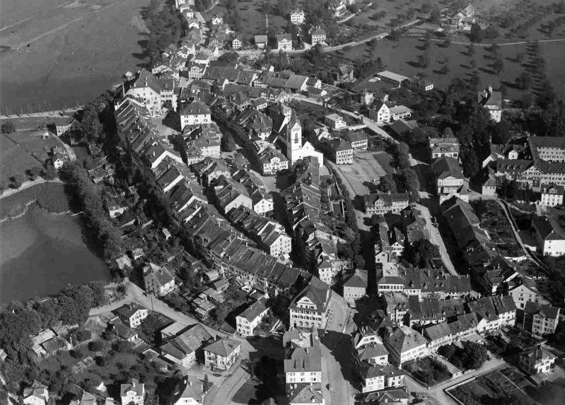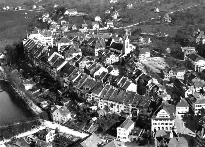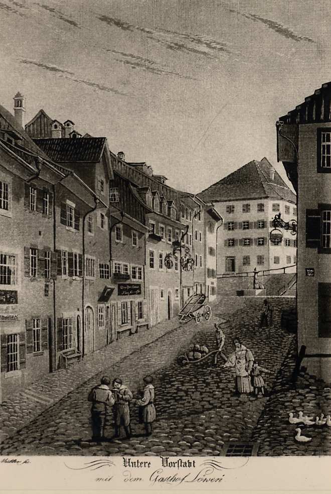 Imposant zeigt sich hier noch heute die in leichtem Bogen geschweifte Front der Bürgerhäuser mit ihren steilen Satteldächern. Ratsprotokolle berichten und ältere Bauten verraten durch ihre innere Konstruktion, dass die heutigen Hausfassaden mit der früheren äusseren Ringmauer identisch sind. Zwischen dieser Mauer und der alten Häuserfront bestand eine etwa sechs Meter breite Lücke, eine Art Rondengang, der den Zugang zur Befestigung frei hielt. Später durften die Gebäude nach aussen erweitert werden, wobei die Mauerkronen als Lager für die aufgestockten Fachwerkgeschosse dienten. Für die Schaffung von Fenstern und Türen wurde dann die Stadtmauer durchbrochen. Die Baustruktur der älteren Häuser zeigt zudem, dass nicht nur nach aussen, sondern auch nach oben ausgebaut wurde. Das war vermutlich im Verlauf des 16. Jahrhunderts der Fall. Ende des 15. Jahrhunderts durfte die Höhe der Ringmauer jedenfalls noch nicht überschritten werden. Diese baulichen Veränderungen mussten vor der Entstehung des Bildes in der Chronik des Johannes Stumpf (1548) erfolgt sein. Da und dort verdeutlichen Renovationen diese Aufstockung, indem die Fachwerkobergeschosse wieder sichtbar gemacht wurden. Auch in den beiden Vorstädten ist der Ausbau der Häuser zur Ringmauer nachgewiesen. Den Bürgern wurde dort gestattet, die Dächer ihrer Häuser auf die Stadtmauer aufzulegen.
