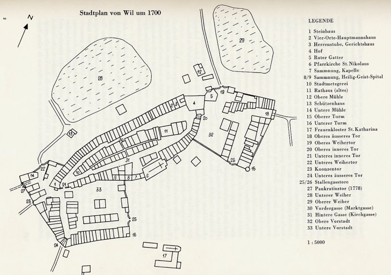 In seiner über 500-jährigen Geschichte als Stadt unter dem äbtischen Krummstab sah Wil nie einen direkten Angreifer auf der Nordwestfront der Altstadt. Der untere Weiher mit dem am Fusse des Stadthügels entlang laufenden Mühlebach und die Ringmauer, die später zur geschlossenen, hohen Häuserfront ausgebaut wurde, bildeten geradezu klassische Angriffshindernisse.