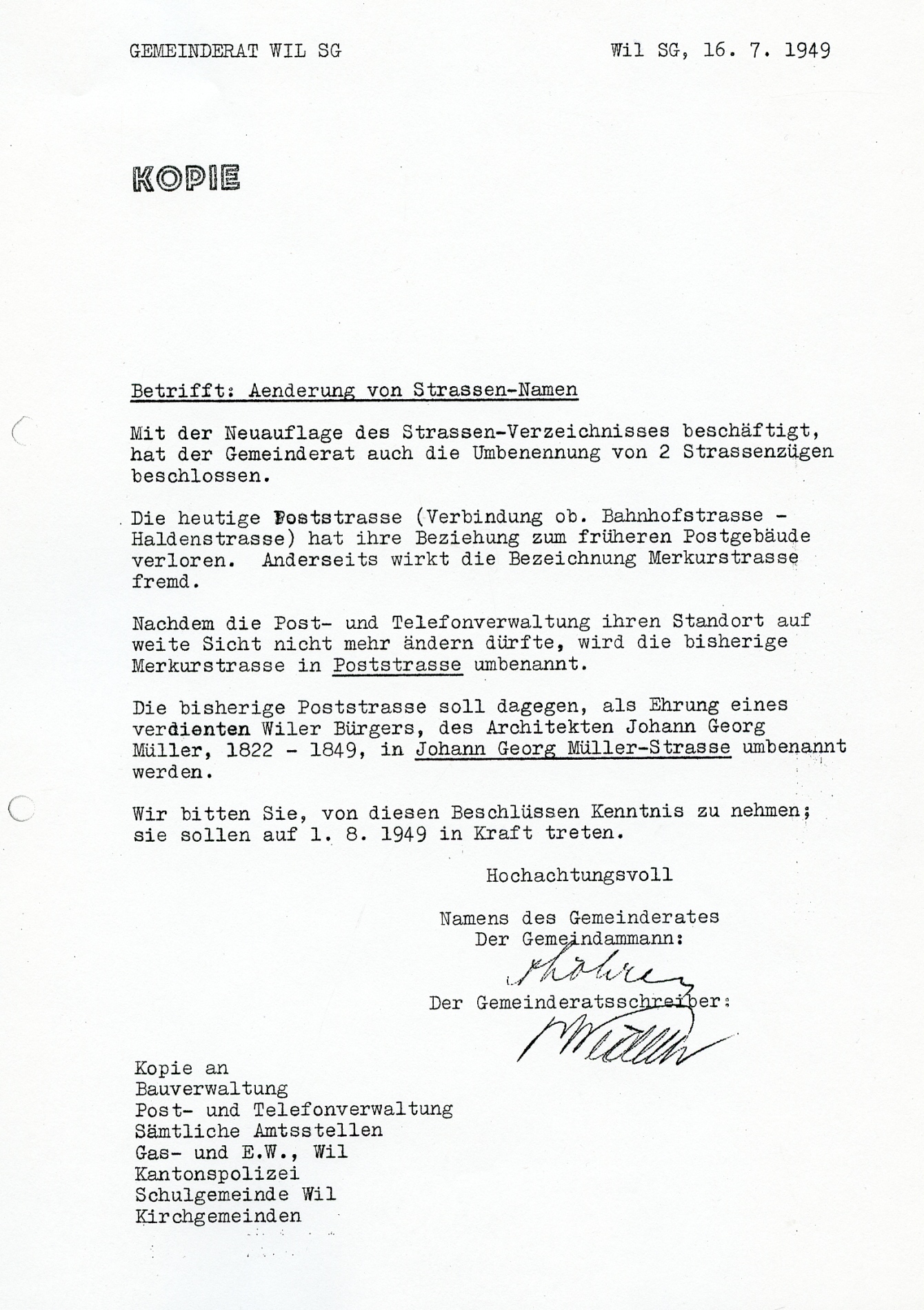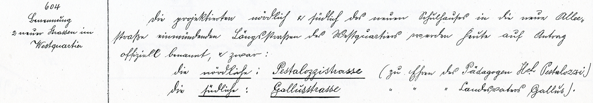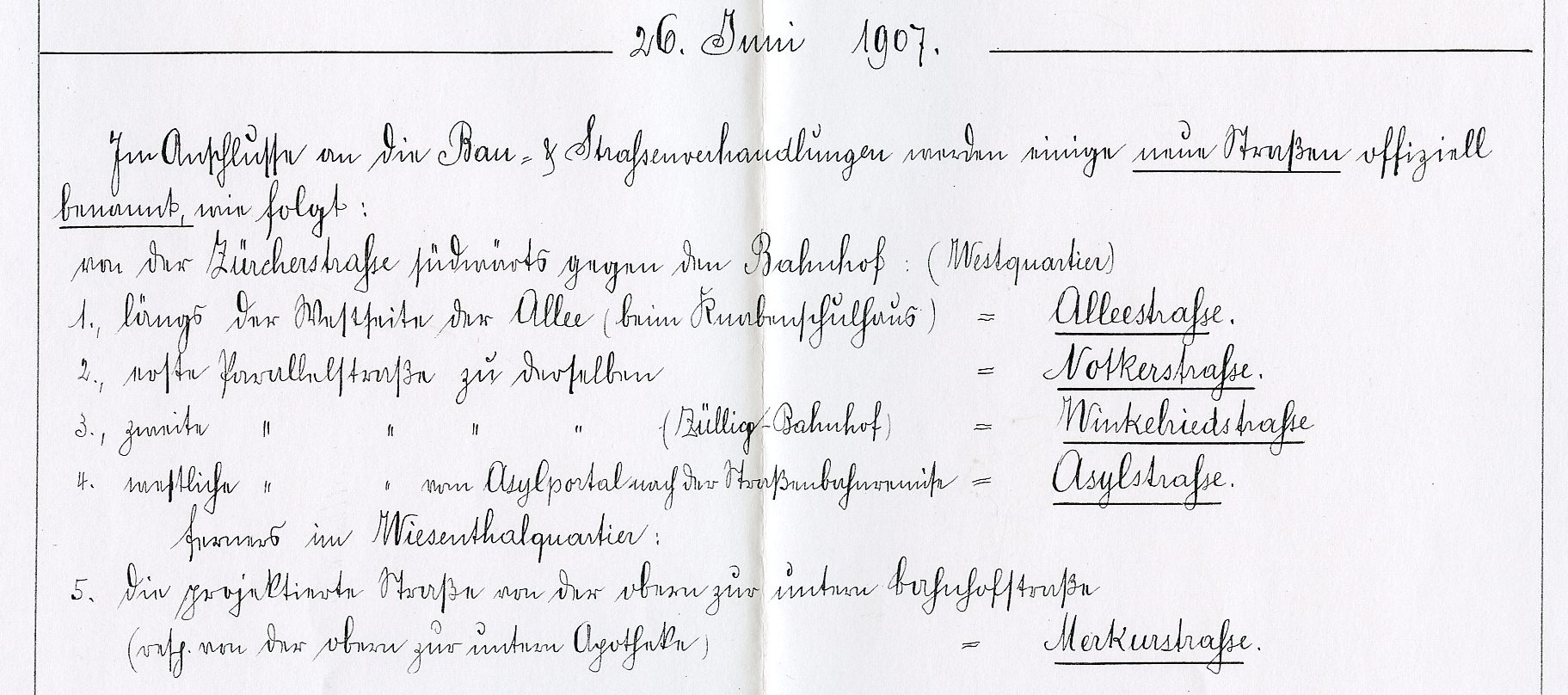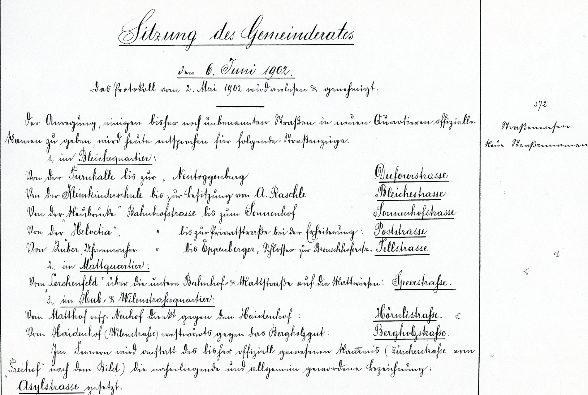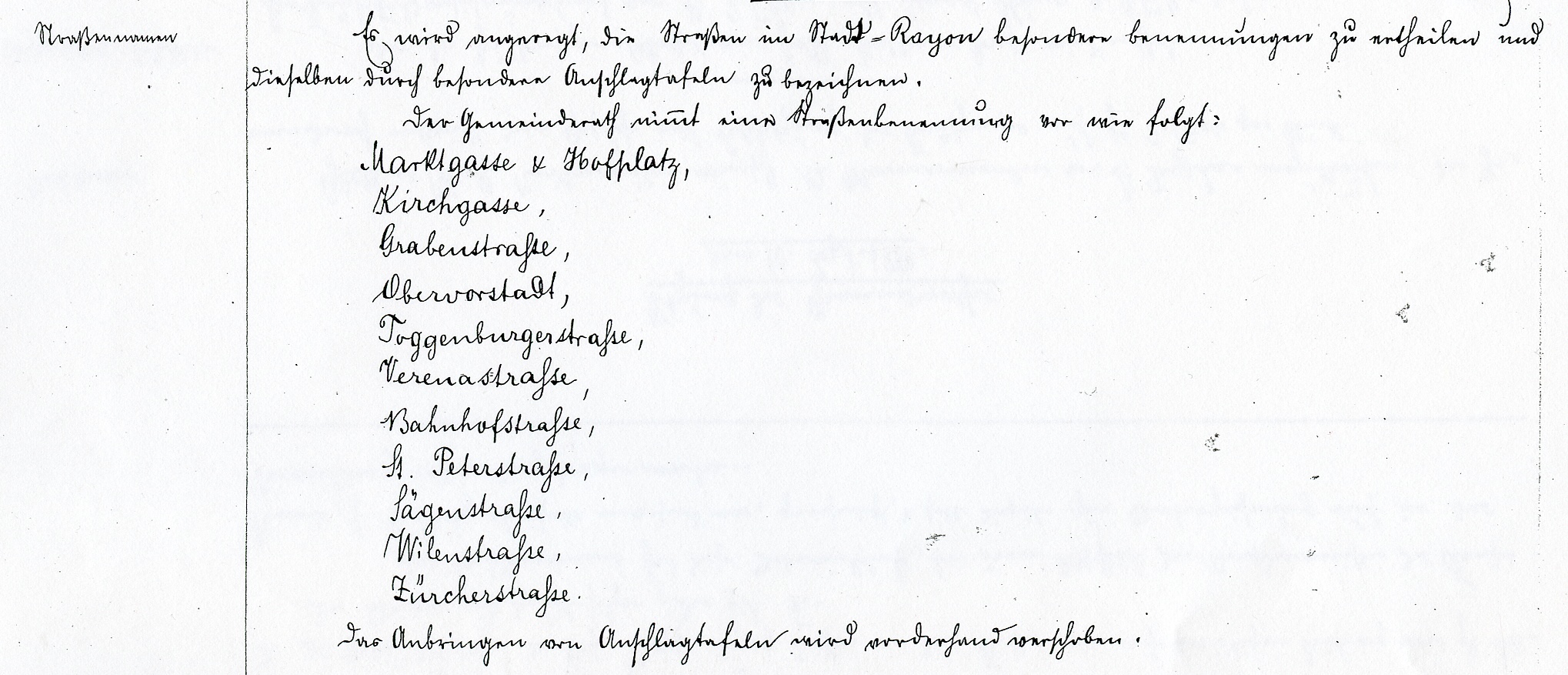 Neben traditionellen Strassenbezeichnungen wie "Marktgasse" (früher "Vordere Gasse") oder "Kirchgasse" (früher "Hintere Gasse") wurden ab 1833/34 mit der Strassenkorrektion und den neuen Quartieren (Südquartier, Westquartier) auch neue Namen benötigt. Die zuständige Strassenkommission schlug jeweils dem Stadtrat die neuen Benennungen vor.