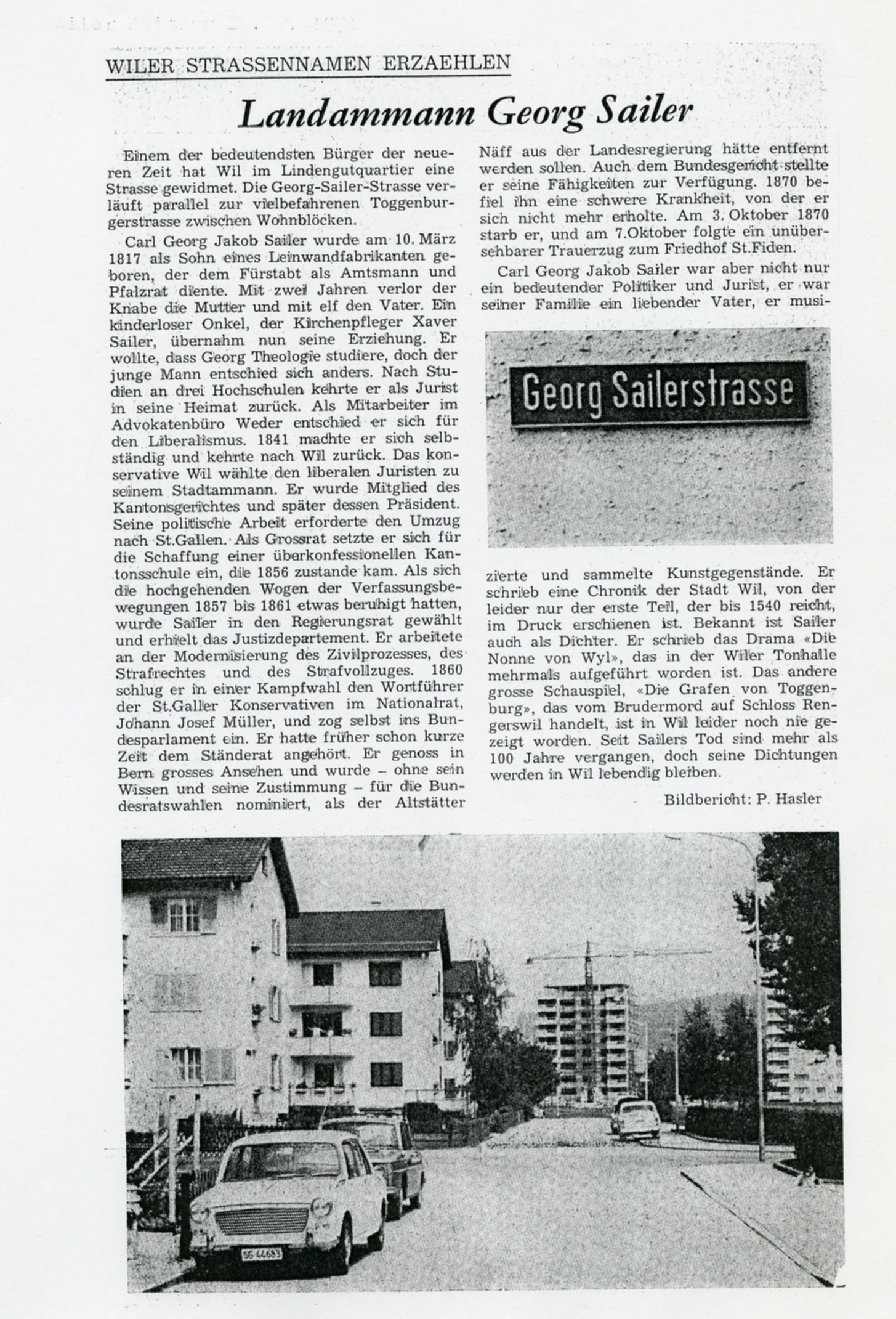 Einem der bedeutendsten Bürger der neueren Zeit hat Wil im Lindengutquartier eine Strasse gewidmet. Die Georg-Sailer-Strasse verläuft parallel zur vielbefahrenen Toggenburgerstrasse zwischen Wohnblöcken.