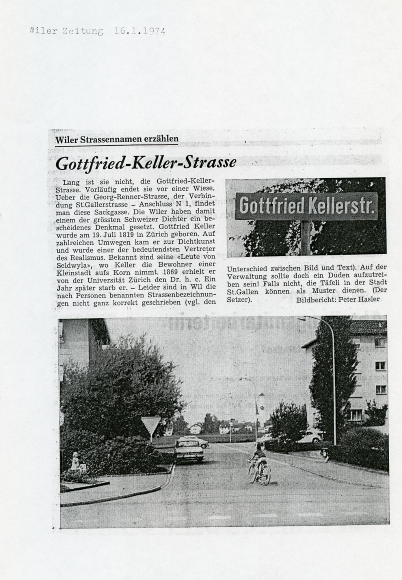 Lang ist sie nicht, die Gottfried-Keller-Strasse. Vorläufig endet sie vor einer Wiese. Über die Georg-Renner-Strasse, der Verbindung St.Gallerstrasse - Anschluss N1, findet man diese Sackgasse. Die Wiler haben damit einem der grössten Schweizer Dichter ein bescheidenes Denkmal gesetzt. Gottfried Keller wurde am 19. Juli 1819 in Zürich geboren. Auf zahlreichen Umwegen kam er zur Dichtkunst und wurde einer der bedeutendsten Vertreter des Realismus. Bekannt sind seine "Leute von Seldwyla", wo Keller die Bewohner einer Kleinstadt aufs Korn nimmt. 1869 erhielt er an der Universität Zürich den Dr. h. c. Im Jahr darauf starb er.