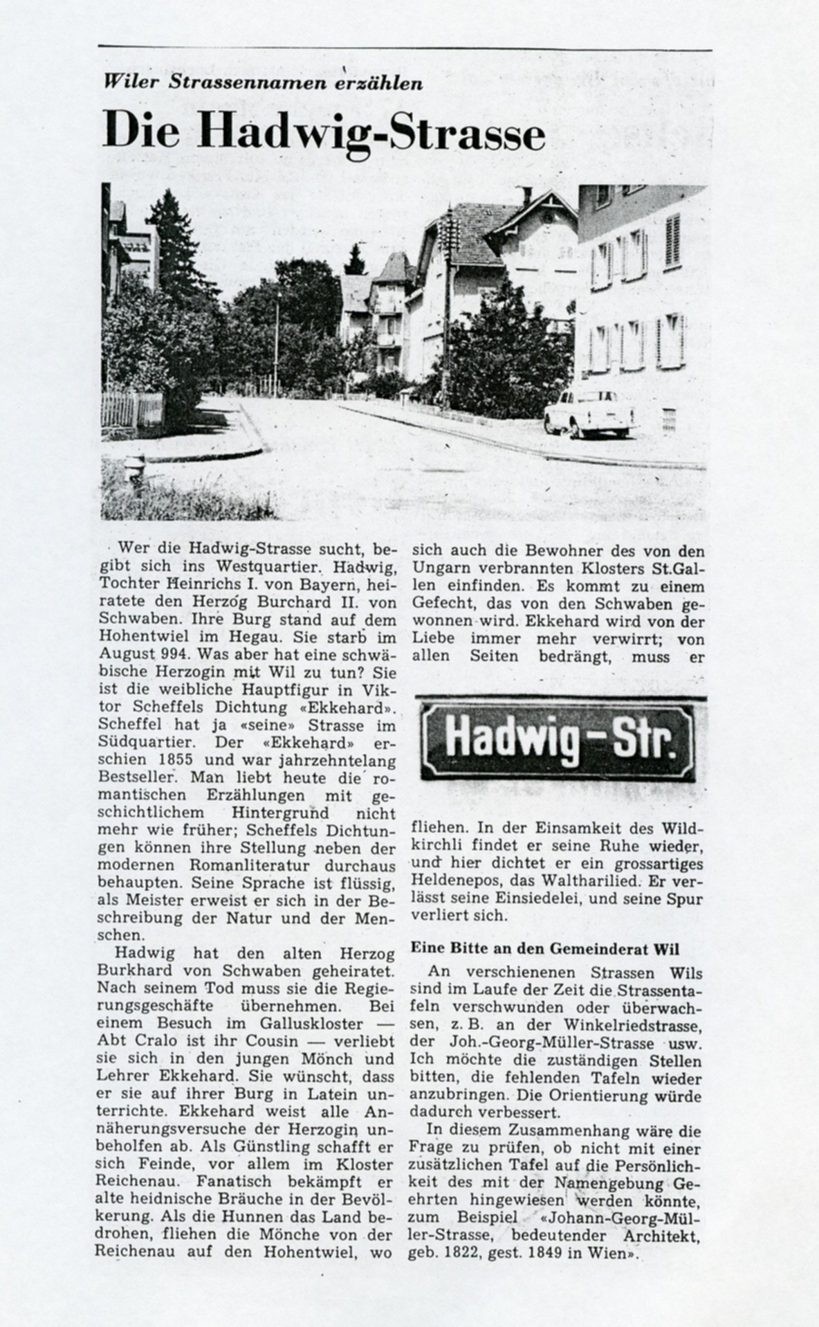 Wer die Hadwig-Strasse sucht, begibt sich ins Westquartier. Hadwig, Tochter Heinrichs I. von Bayern, heiratete den Herzog Burchard II. von Schwaben. Ihre Burg stand auf dem Hohentwiel im Hegau. Sie starb im August 994.