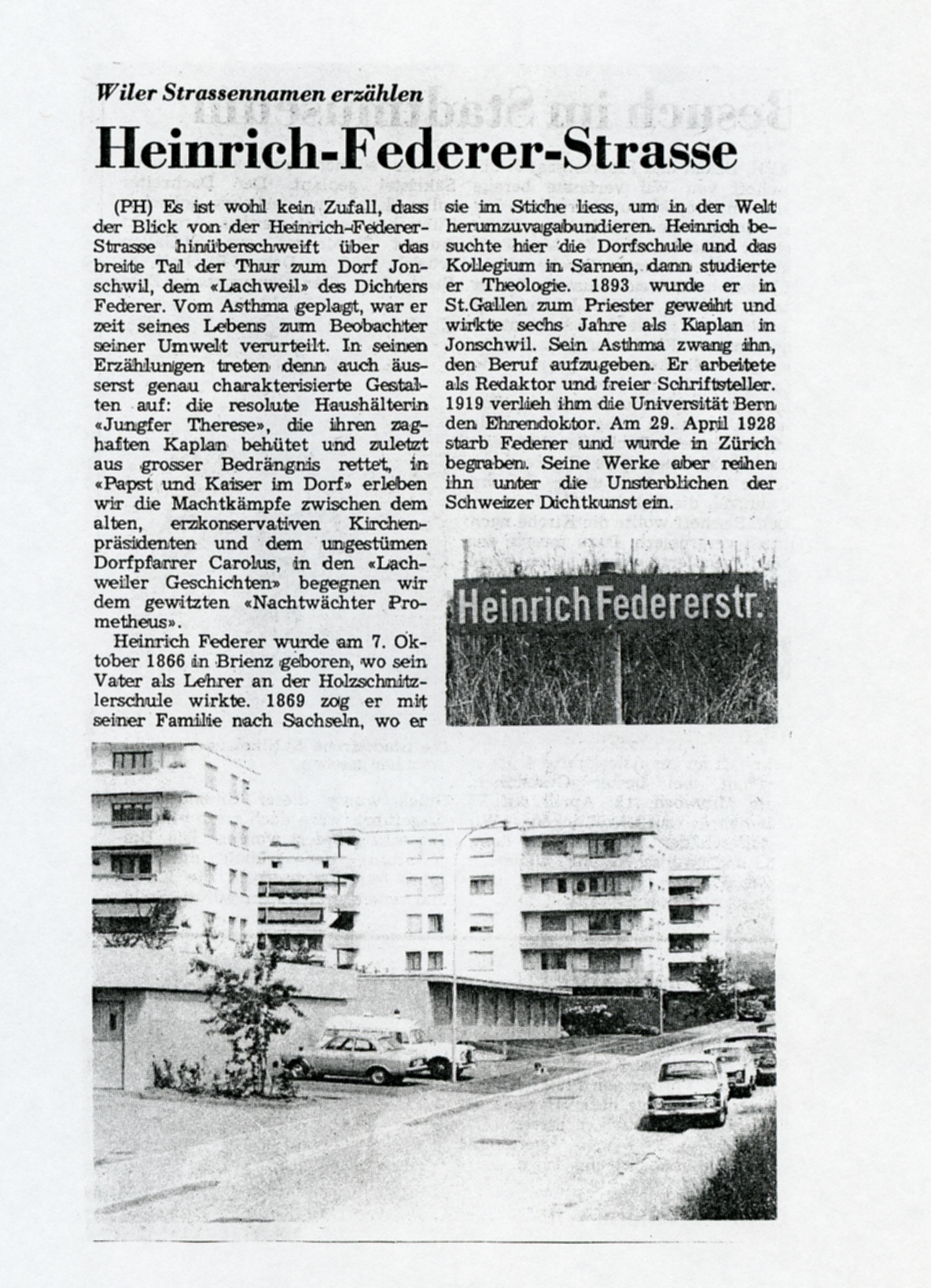 Es ist wohl kein Zufall, dass der Blick von der Heinrich-Federer-Strasse hinüberschweift über das breite Tal der Thur zum Dorf Jonschwil, dem "Lachweil" des Dichters Federer. Vom Asthma geplagt, war er zeit seines Lebens zum Beobachter seiner Umwelt verurteilt. In seinen Erzählungen treten denn auch äusserst genau charakterisierte Gestalten auf.