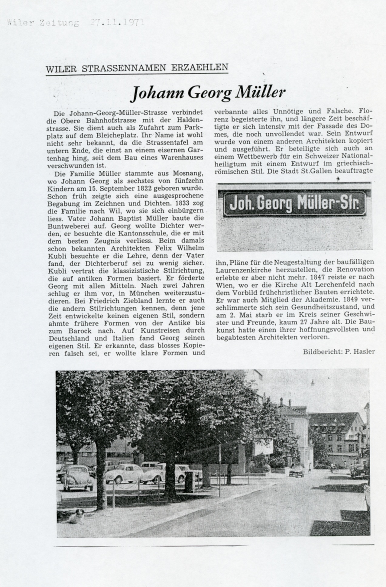 Die Johann-Georg-Müller-Strasse verbindet die Obere Bahnhofstrassse mit der Haldenstrasse. Sie dient auch als Zufahrt zum Parkplatz auf dem Bleicheplatz.