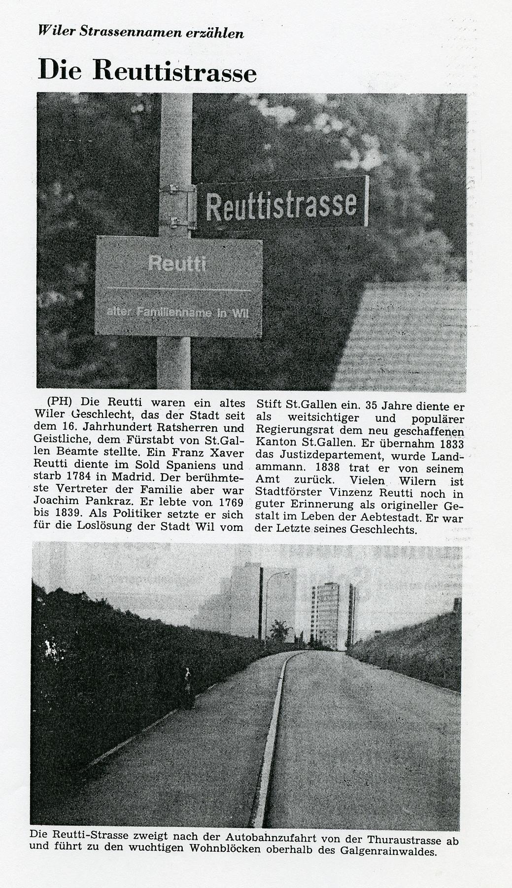 Die Reutti war ein altes Wiler Geschlecht, das der Stadt seit dem 16. Jahrhundert Ratsherren und Geistliche und dem Fürstabt von St.Gallen Beamte stellte. Ein Franz Xaver Reutti diente im Sold Spaniens und starb 1784 in Madrid.