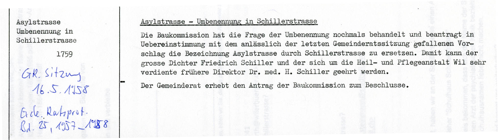 Die Schillerstrasse hiess ab 26.6.1907 zuerst Asylstrasse. Auf dem Zonenplan 1956 ist sie noch als Asylstrasse aufgeführt. Am 16. Mai 1958 wurde sie in "Schillerstrasse" umbenannt.