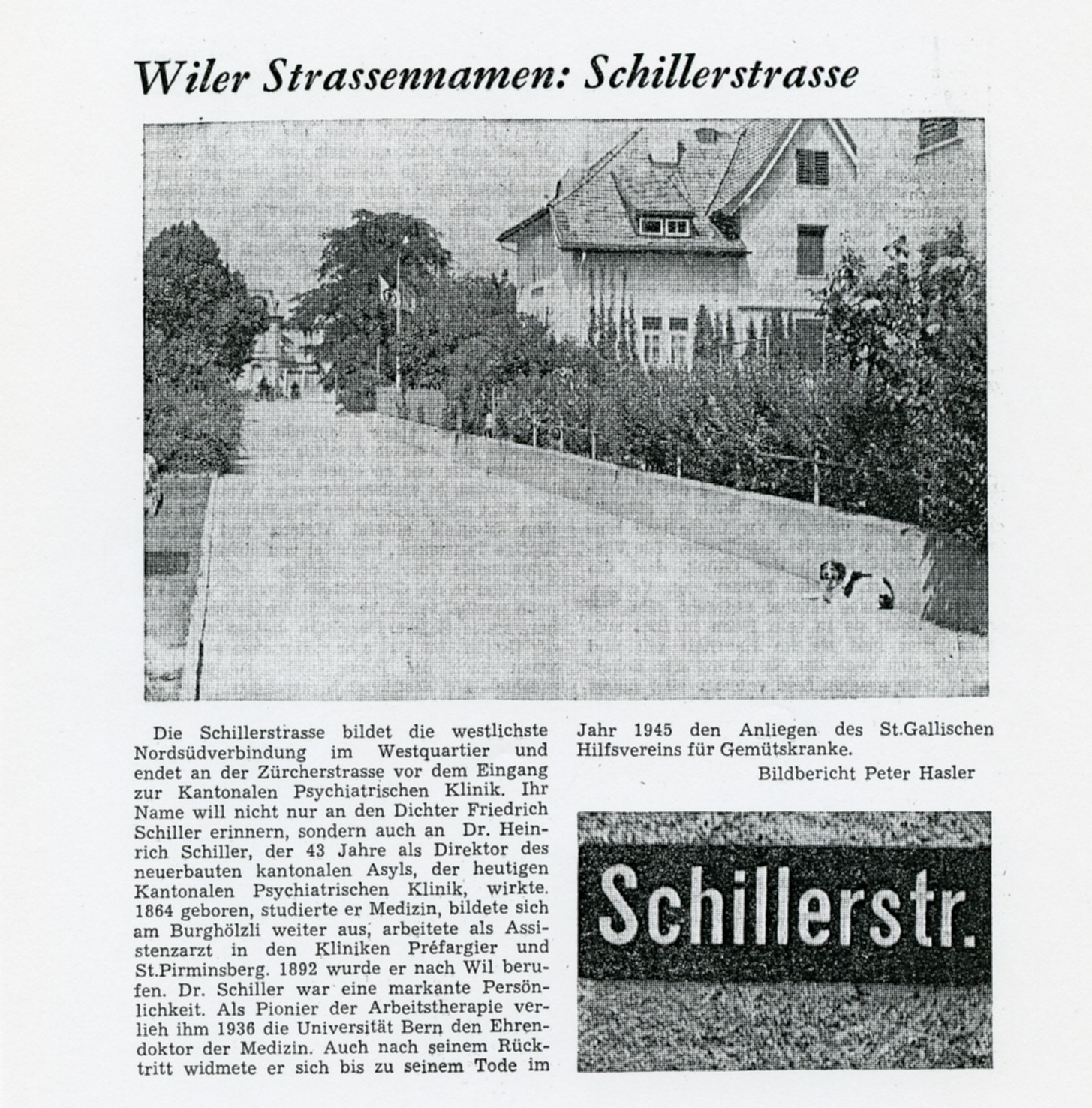 Ihr Name will nicht nur an den Dichter Friedrich Schiller erinnern, sondern auch an Dr. Heinrich Schiller, der 43 Jahre als Direktor des neuerbauten kantonalen Asyls, der heutigen Kantonalen Psychiatrischen Klinik, wirkte. 1864 geboren, studierte er Medizin, bildete sich am Burghölzli weiter aus, arbeitete als Assistenzarzt in den Kliniken Préfargier und St. Pirminsberg. 1892 wurde er nach Wil berufen. Dr. Schiller war eine markante Persönlichkeit. Als Pionier der Arbeitstherapie verlieh ihm 1936 die Universität Bern den Ehrendoktor der Medizin. Auch nach seinem Rücktritt widmete er sich bis zu seinem Tode im Jahr 1945 den Anliegen des St. Gallischen Hilfsvereins für Gemütskranke.