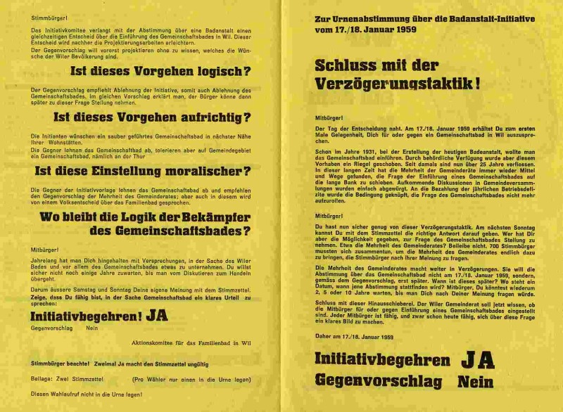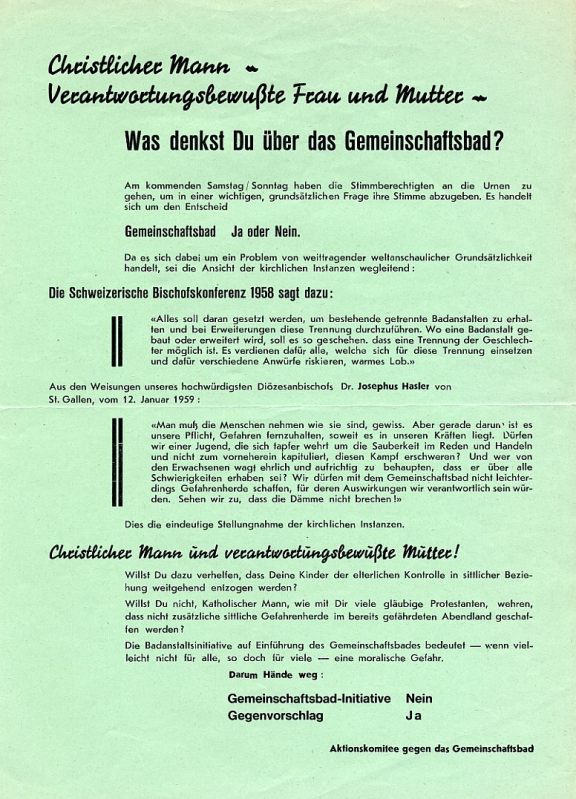 Als um 1958 die Planung der Sport- und Spielanlage Bergholz soweit war, dass eine Abstimmung die nötigen Mittel beschaffen sollte, wurde vor allem die geplante Badanstalt mit gemischtem Betrieb stark angegriffen. Mann und Frau, Knabe und Mädchen zusammen, dies war ein Politikum erster Güte.