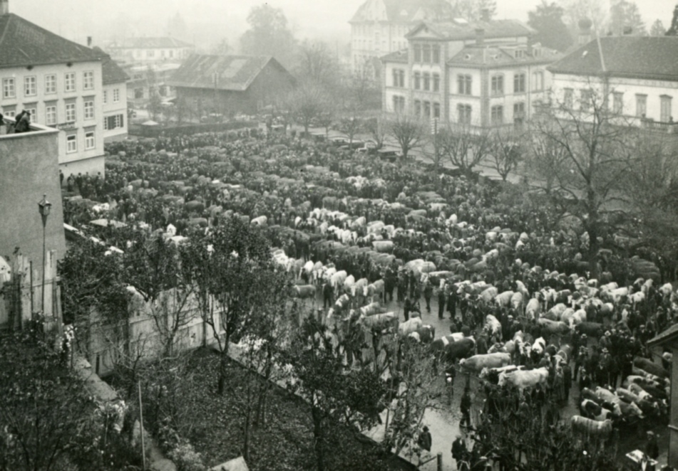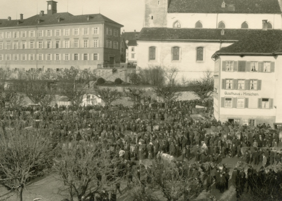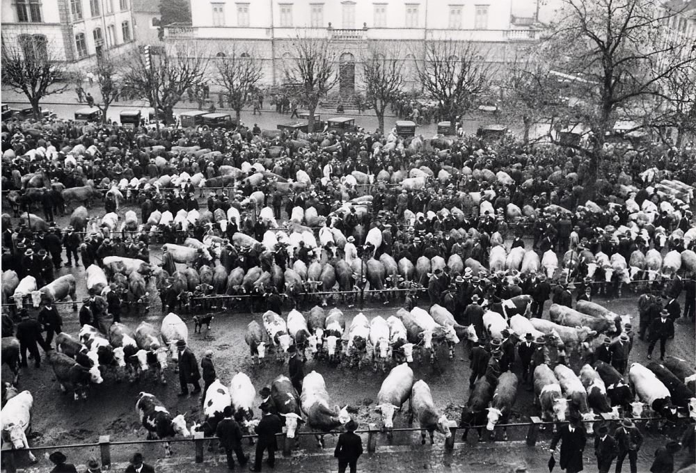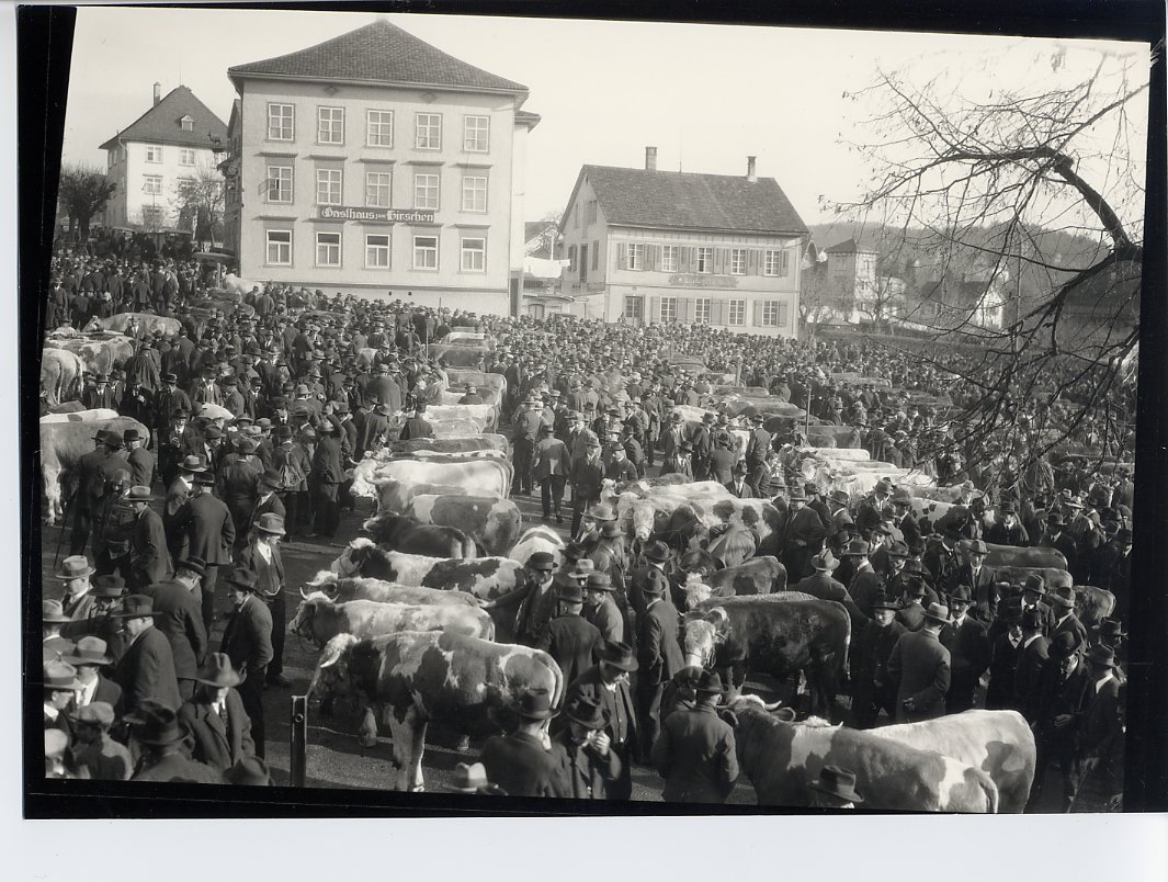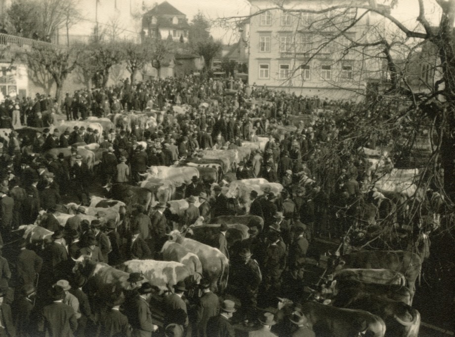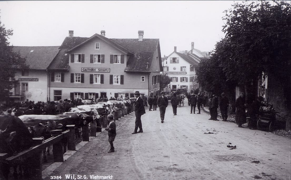 Vor der Oeffnung der Altstadt Wil anlässlich der Strassenkorrektion von 1833/34 wurden alle Märkte auf dem "Goldenen Boden" vor dem Hof abgehalten, auch der Viehmarkt. Erst danach wurde dieser auf dem "Viehmarktplatz" gegen die Tonhalle abgehalten. Während heute an den Jahrmärkten nur noch ganz wenig Vieh gehandelt wird, zeigen die Aufnahmen ab 1900 doch die frühere Bedeutung.