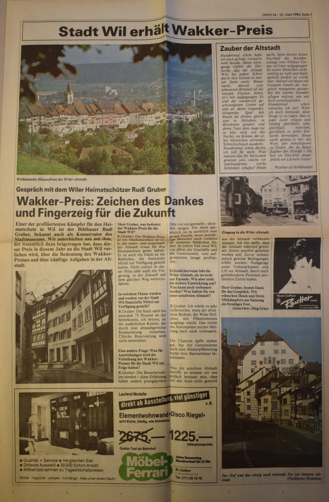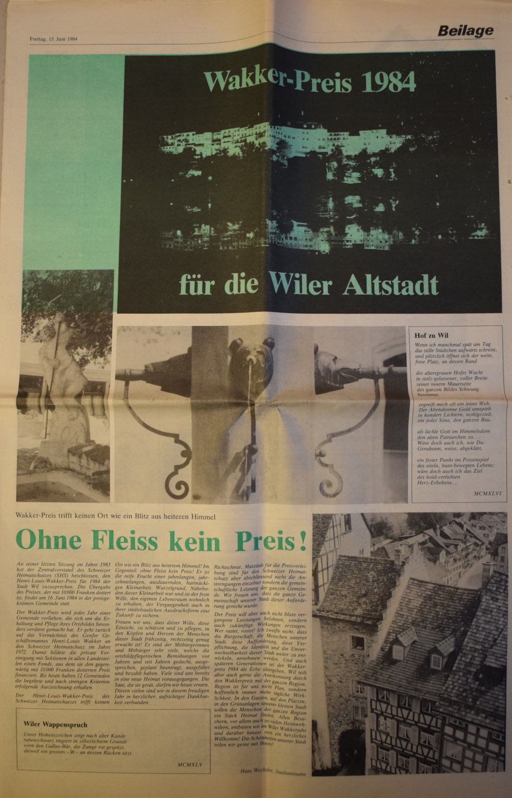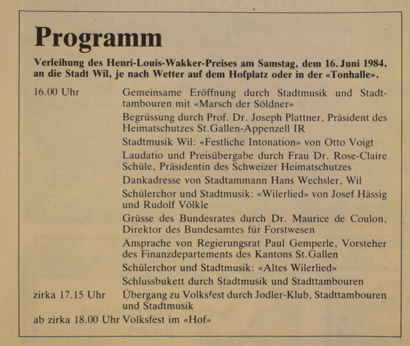 Am 16. Juni 1984 hat die Stadt Wil den Henri-Louis-Wakker-Preis des schweizer Heimatschutzes erhalten. Wil erhielt den Preis für "die sorgfältige, integrale bauliche Erhaltung der Altstadt und deren Aufwertung als Lebensraum, aber auch für die Zentrums- planung in der näheren Umgebung."