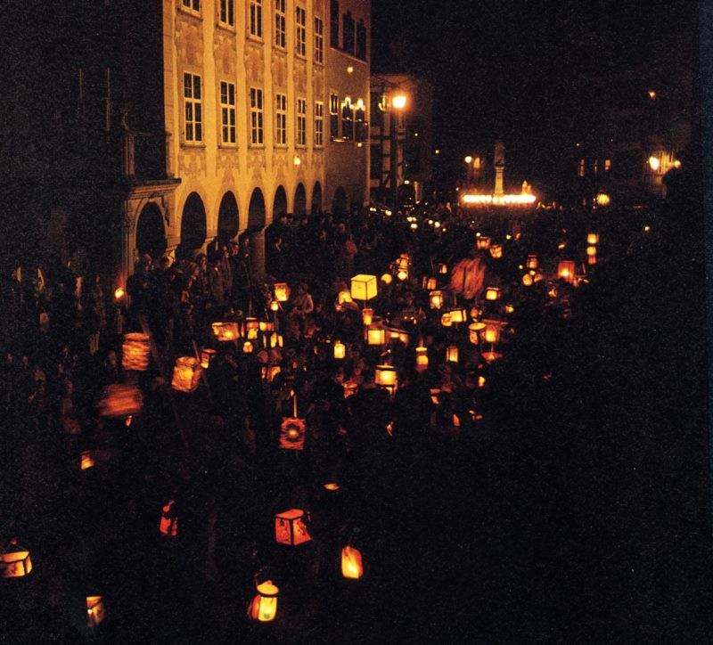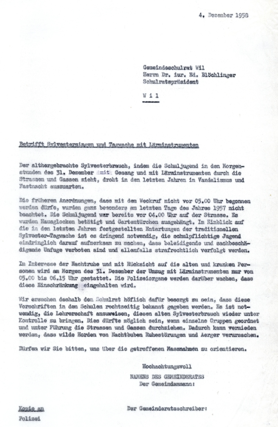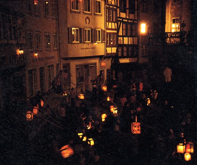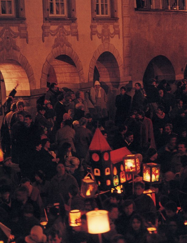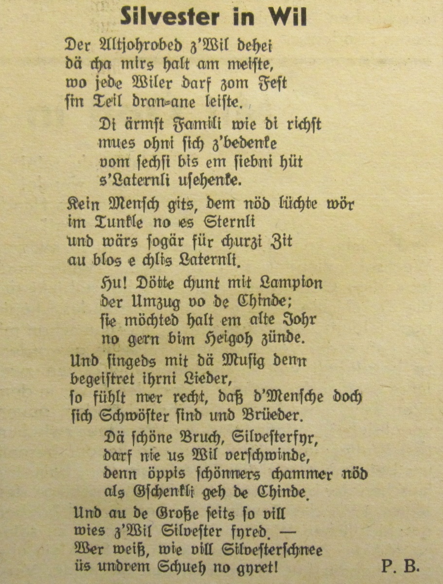Zum Jahresende nun besitzt und pflegt Wil einen speziellen Brauch. Ausgehend von den alten Feuerpolizeiordnungen, die vorschrieben, dass bei einem nächtlichen Brandausbruch "behufs besserer Beleuchtung der Strassen" jede Haushaltung eine brennende Laterne herauszuhängen hatte, liess die Gemeindebehörde jeweils am Silvesterabend das Vorhandensein der Laternen kontrollieren. Aus dieser "Laternenvisitation" hat sich einer der stimmungsvollsten Wiler Bräuche entwickelt, indem gleichzeitig mit der Kontrolle die Wiler Schulkinder mit farbigen Papierlaternen ihren Umzug halten. Begleitet von der Stadtmusik zieht der bunte Zug durch die Wiler Altstadt. Gespannt präsentiert jedes Kind seine selbstgefertigte Laterne, hofft es doch im Stillen, bei der Prämierung auf einen vorderen Rang zu gelangen. An verschiedenen Stellen in der Stadt erfolgt ein Halt, wird gesungen und das alte Jahr gebührend verabschiedet. Auch uns "hartgesottenen" Menschen des 21. Jahrhunderts wird es dabei warm ums Herz, wenn, inmitten der stimmungsvollen Kulisse der Wiler Altstadt, die Töne in die klare Nachtluft steigen und sich die bunten Lichter in den Scheiben der Häuser spiegeln.