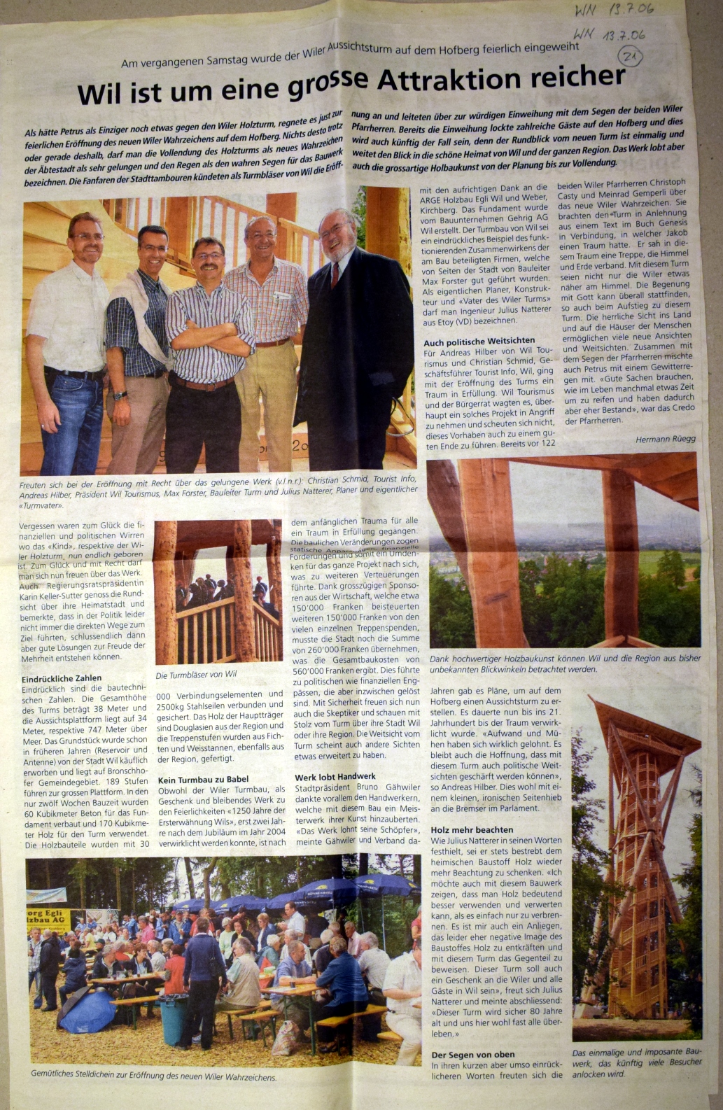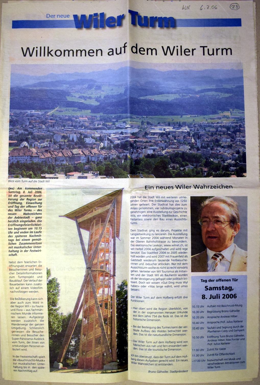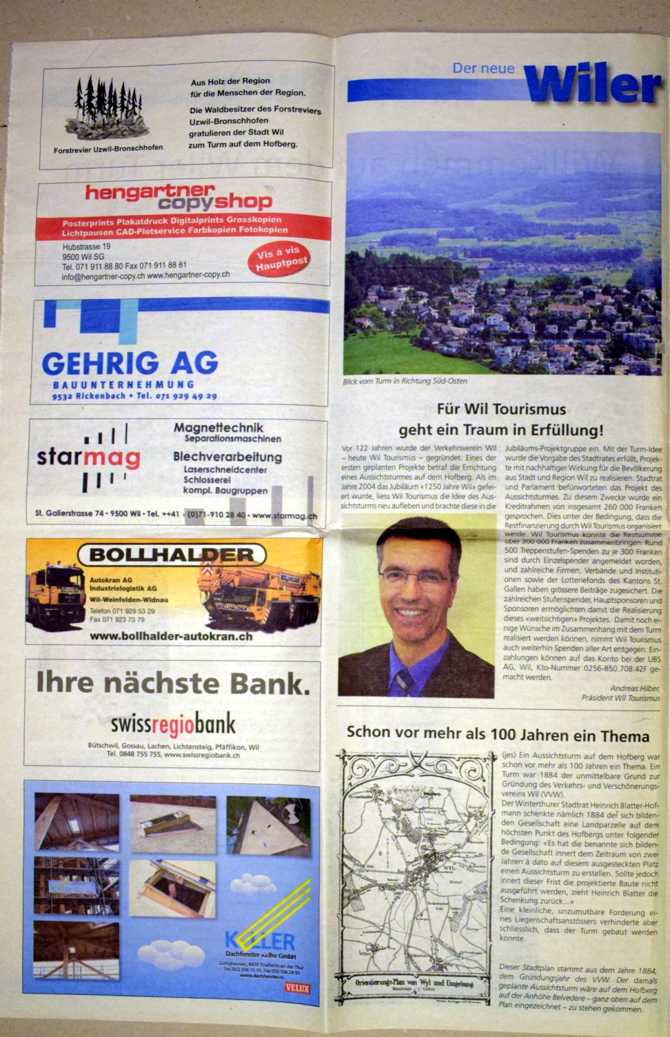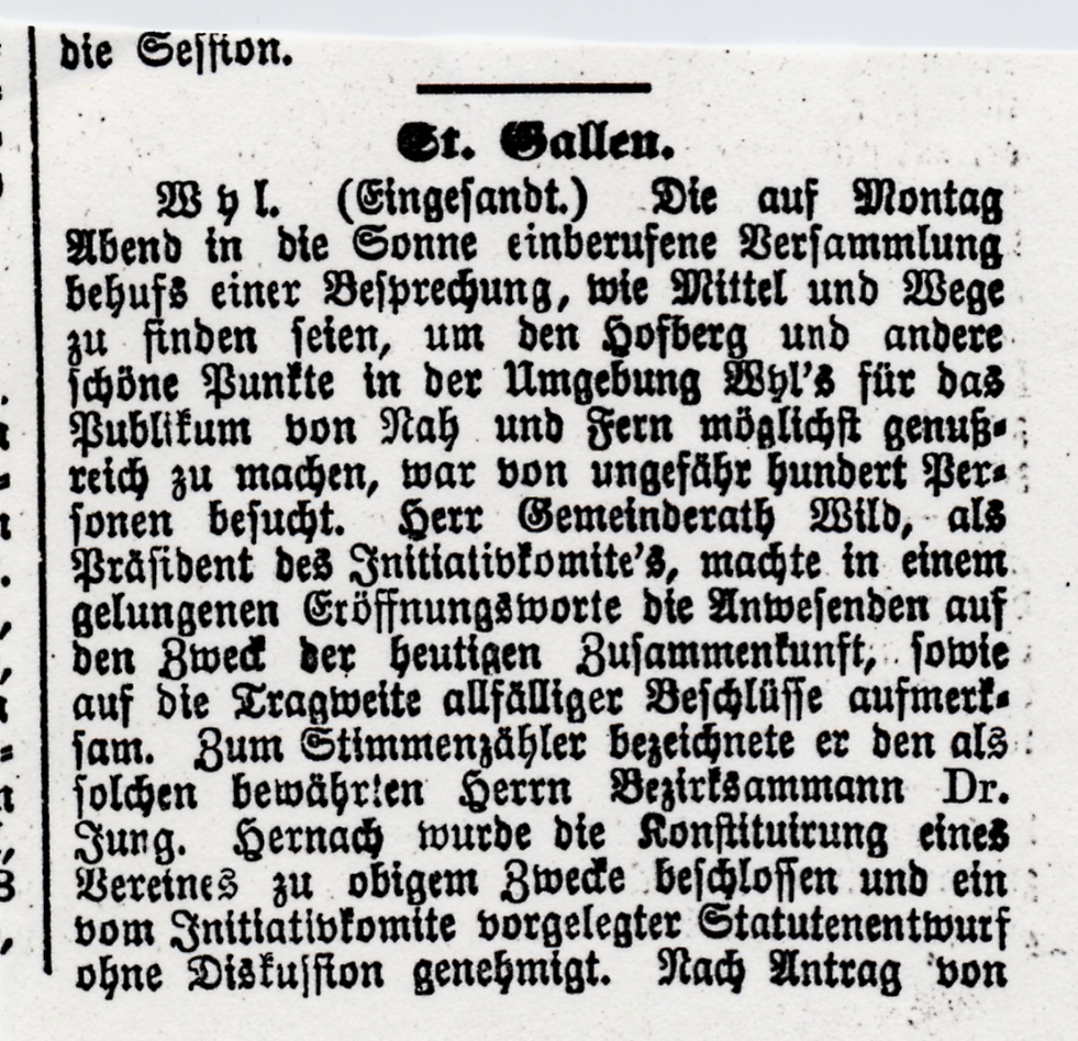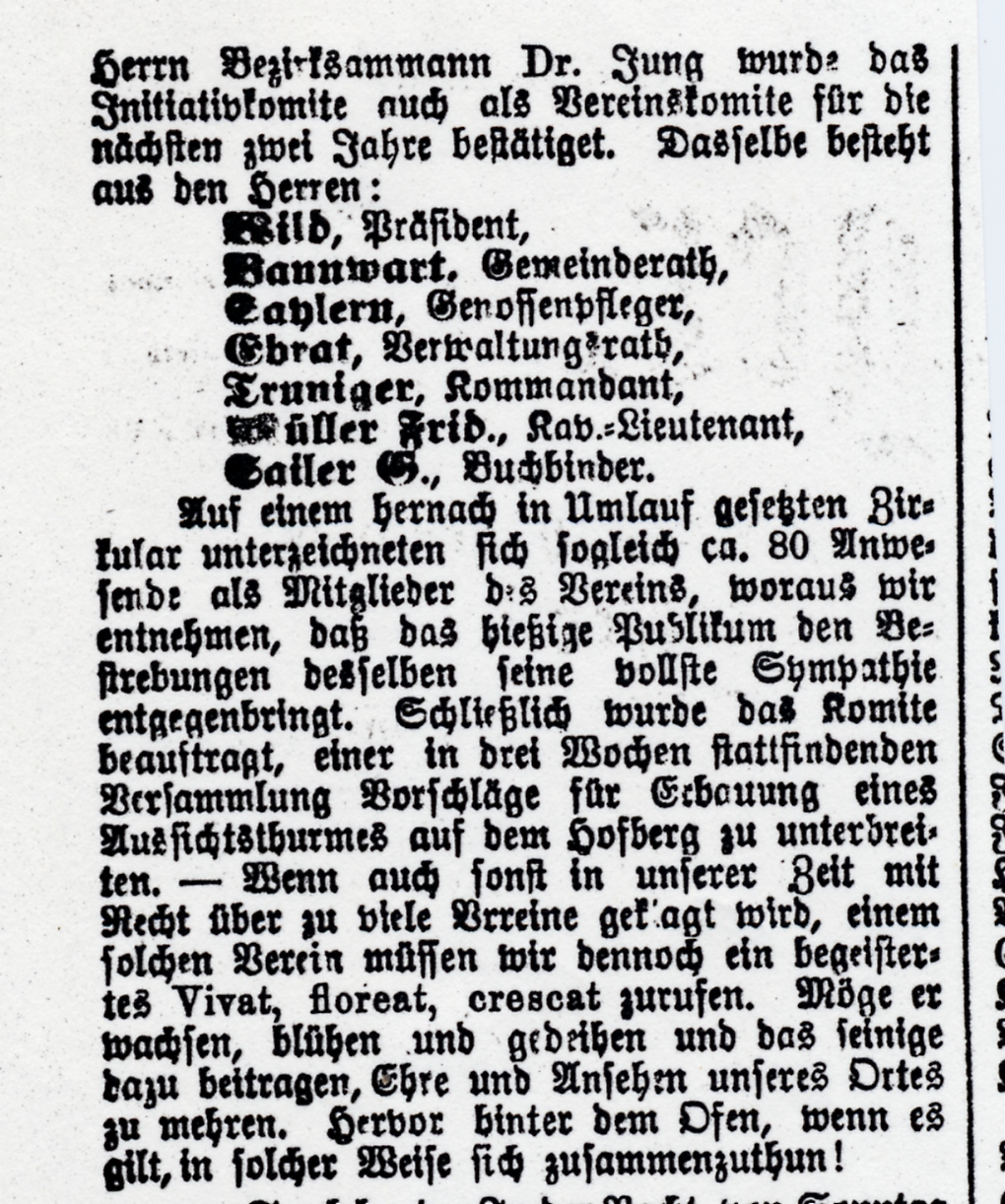 Mit dem geplanten Bau eines Aussichtsturms auf dem Hofberg beginnt die Geschichte des heutigen Vereins "Wil Tourismus". Das Projekt wird 1884 lanciert und steht mit gesicherter Finanzierung vor dem Baubeginn. Erhebliche Schwierigkeiten mit einem Grundstückanstösser lassen es scheitern. Anlass zu diesem Turmprojekt war eine Panorama-Ansicht der "schönen und weiten Fernsicht vom Hofberg", in Auftrag gegeben von Buchbinder Franz Gallus Sailer, gezeichnet im Oktober 1883 von Heinrich Rottensweiler. Dieser war gebürtig von Thalwil, wirkte 1852-1893 als Lehrer in Hinwil und war weit herum bekannt als hervorragender Landschaftsmaler. Die Idee eines Turmbaus ............... (siehe unten, pdf) 2006 konnte der Turm der Oeffentlichkeit übergeben werden. www.wiler-turm.ch (aus: 125 Jahre Wil Tourismus 2009)