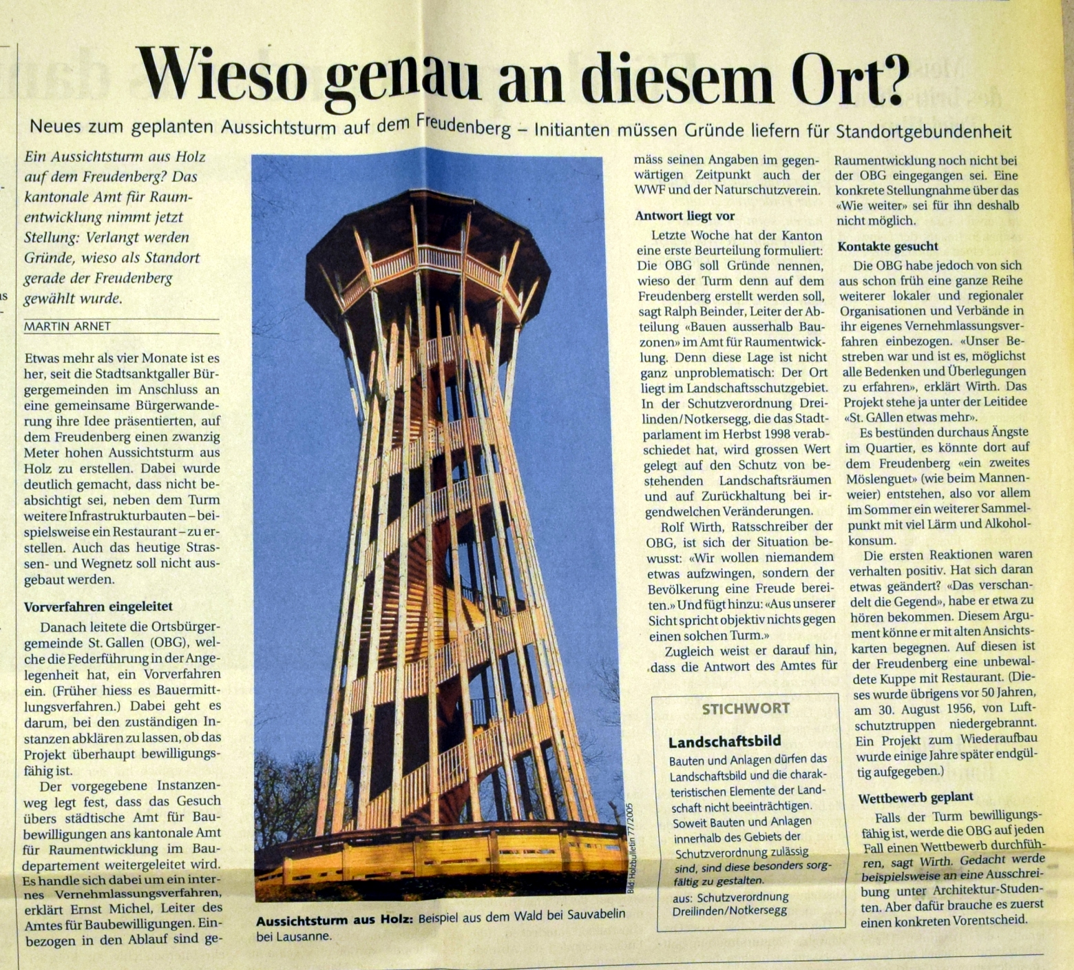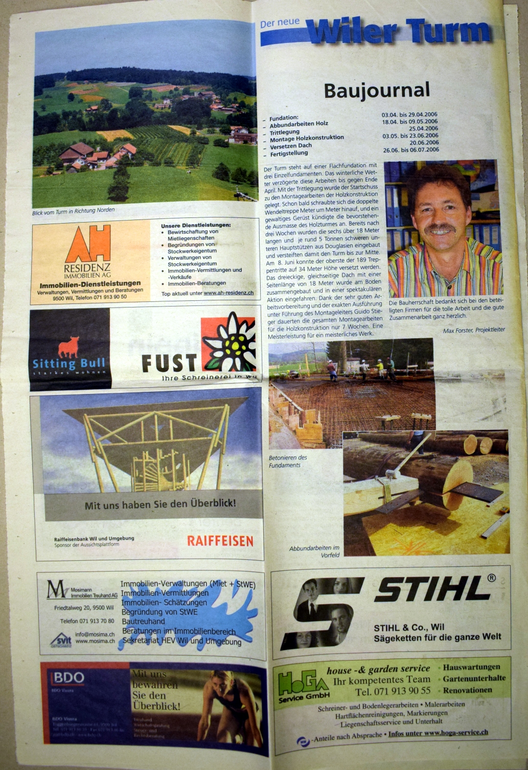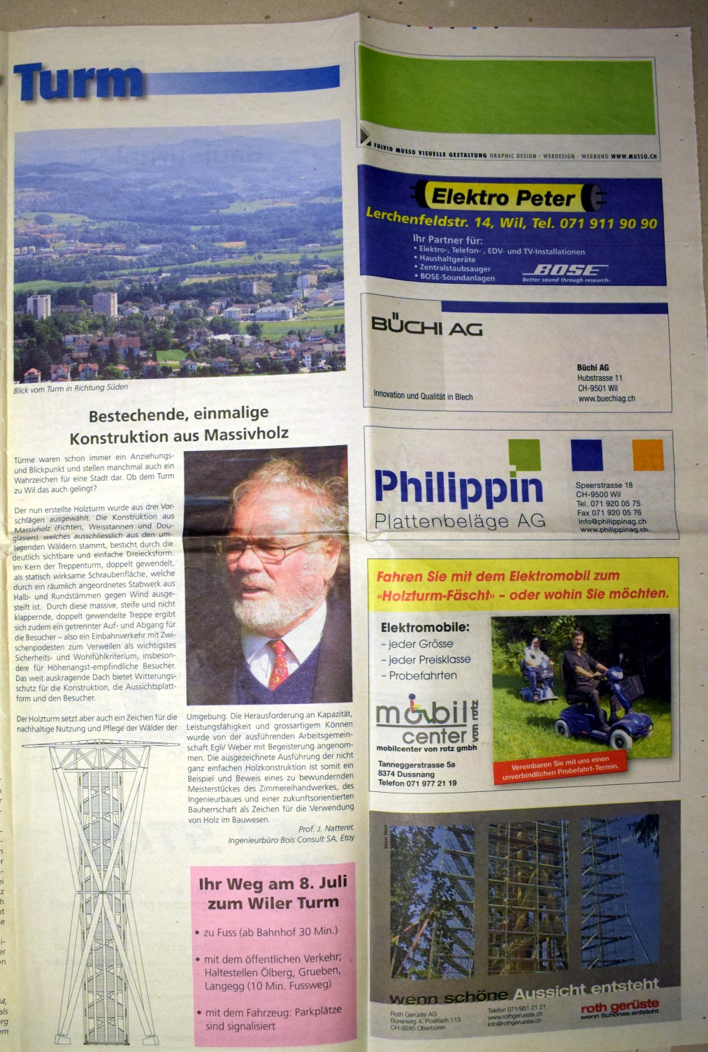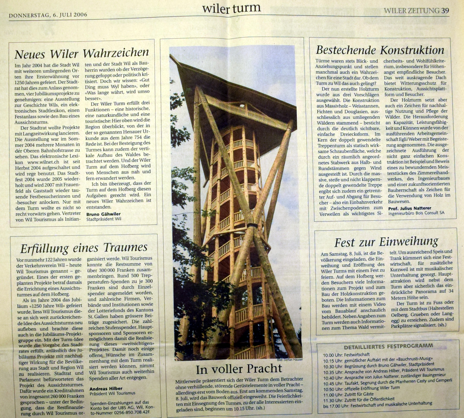 Mit dem geplanten Bau eines Aussichtsturms auf dem Hofberg beginnt die Geschichte des heutigen Vereins "Wil Tourismus". Das Projekt wird 1884 lanciert und steht mit gesicherter Finanzierung vor dem Baubeginn. Erhebliche Schwierigkeiten mit einem Grundstückanstösser lassen es scheitern. Anlass zu diesem Turmprojekt war eine Panorama-Ansicht der "schönen und weiten Fernsicht vom Hofberg", in Auftrag gegeben von Buchbinder Franz Gallus Sailer, gezeichnet im Oktober 1883 von Heinrich Rottensweiler. Dieser war gebürtig von Thalwil, wirkte 1852-1893 als Lehrer in Hinwil und war weit herum bekannt als hervorragender Landschaftsmaler. Die Idee eines Turmbaus ............... (siehe unten, pdf) 2006 konnte der Turm der Oeffentlichkeit übergeben werden. www.wiler-turm.ch (aus: 125 Jahre Wil Tourismus 2009)