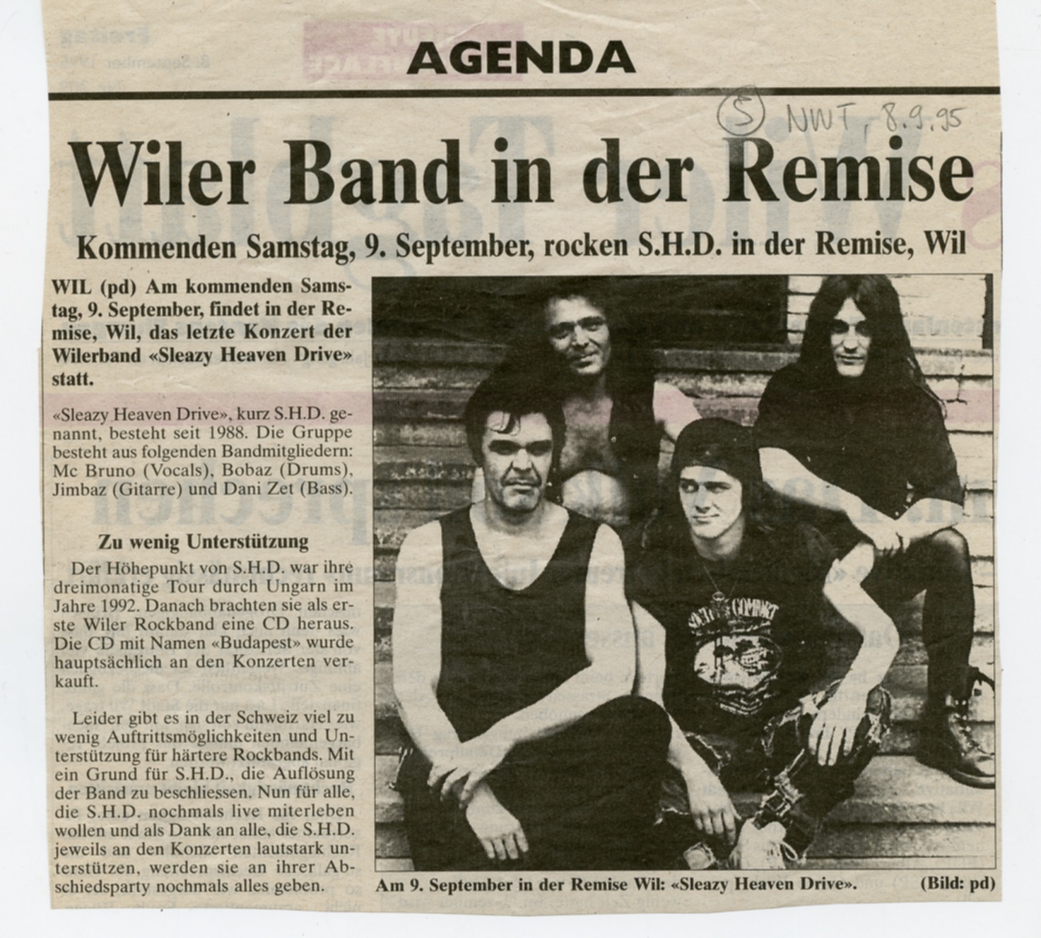 Besetzung Bruno "Brüni" Gähwiler (Voc), Oskar "Jimmy" Boppart (Git), Dany Zingg (Bass), Kurt Boppart (Drums) Werdegang + Stil "Sleazy Heaven Drive" formierte sich aus vier damals in Wil ansässigen Musikern, welche zuvor in regional bekannten Bands spielten. Jimmy und Kurt Boppart, sowie Dani Zingg kannten sich schon einige Zeit und spielten harten Rock. Nachdem Sänger Brüni Gähwiler zur Band stiess, bekam der Heavy Metal von "Sleazy Heaven Drive", vor allem durch die markante, trockene Stimme des Sängers, eine punkige Note. Die CD "Budapest" folgte, welche teils in Ungarn und teils in der Schweiz produziert wurde. Danach folgten Auftritte in Ungarn und der Schweiz, wobei vor allem die Tournee in Ungarn, mit Auftritten in Budapest, einen legendären Ruf geniesst, weil unter anderem auch ein ganzer Car voll Fans aus Wil und Umgebung mitgereist sind. Nach einer intensiven Bandzeit kam es schliesslich zum realen "Sleazy Heaven Drive".