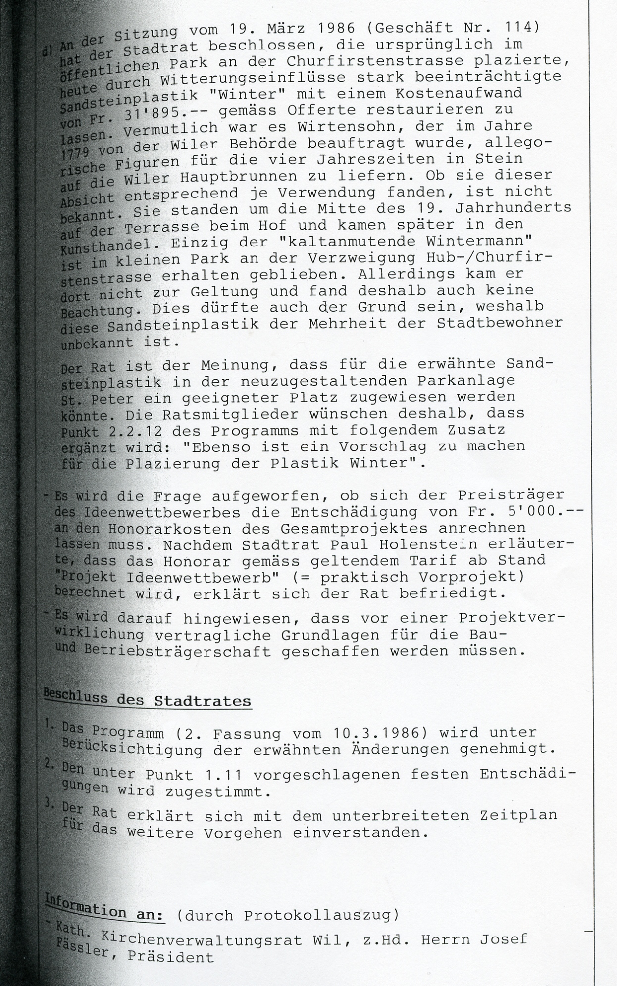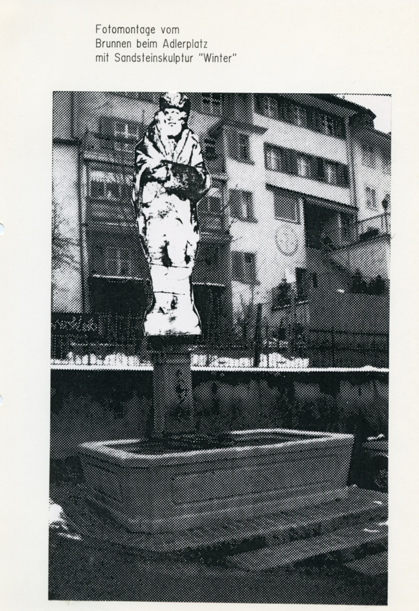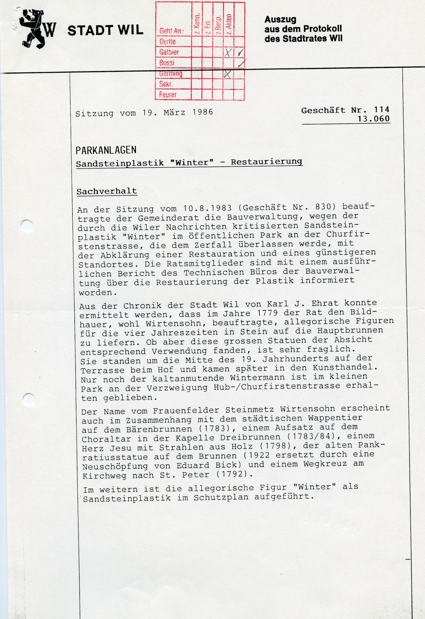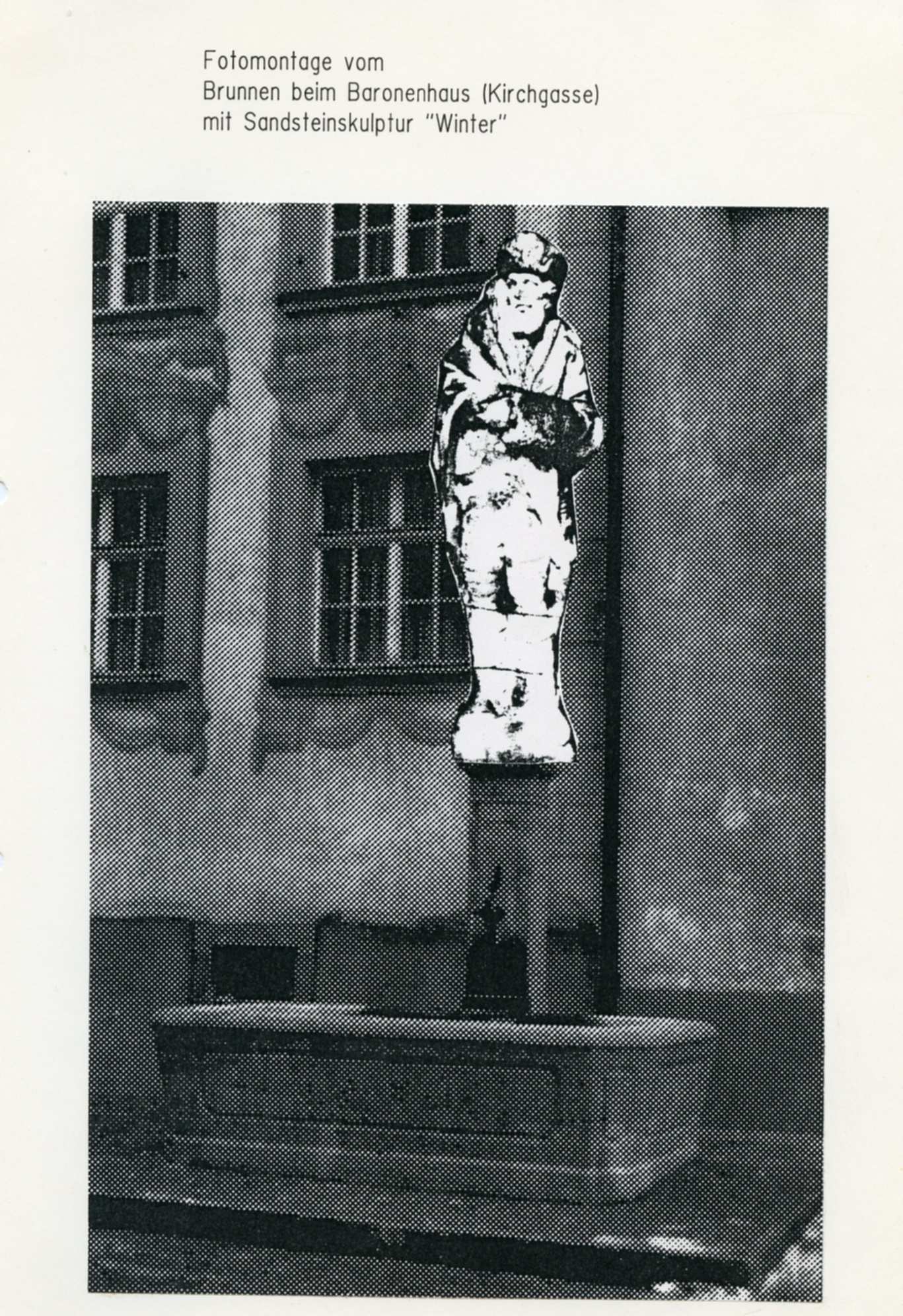 "1779 wurde er beauftragt, vier allegorische Figuren der vier Jahreszeiten in Stein auf die Hauptbrunnen zu liefern. Ob aber diese grossen Statuen der Absicht entsprechend Verwendung fanden, ist sehr fraglich. Sie standen um die Mitte des 19. Jahrhunderts auf der Terrasse beim Hof und kamen später in den Kunsthandel. Nur noch der kaltanmutende Wintersmann ist im kleinen Park beim Bahnübergang an der Hubstrasse erhalten geblieben", so schrieb Karl Ehrat in seiner "Chronik von Wil" von 1958. Die Figur wurde im Laufe der Zeit schadhaft. Ab 1983 wurde eine Restauration ins Auge gefasst. Weil aber die Figur in einem so schlechten Zustand war, wurde 1986 davon Abstand genommen. Die Figur blieb im Werkhof, wo sie dann entsorgt wurde.