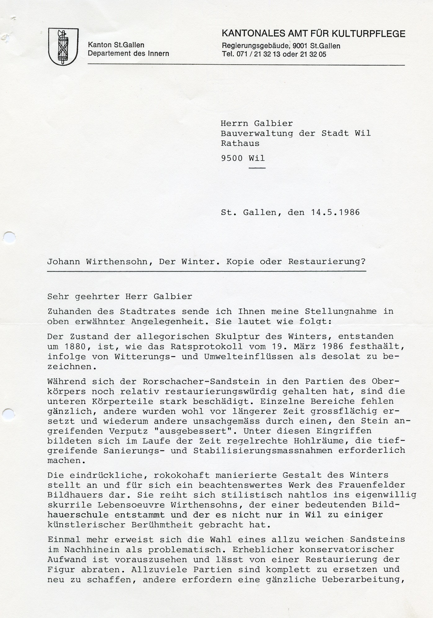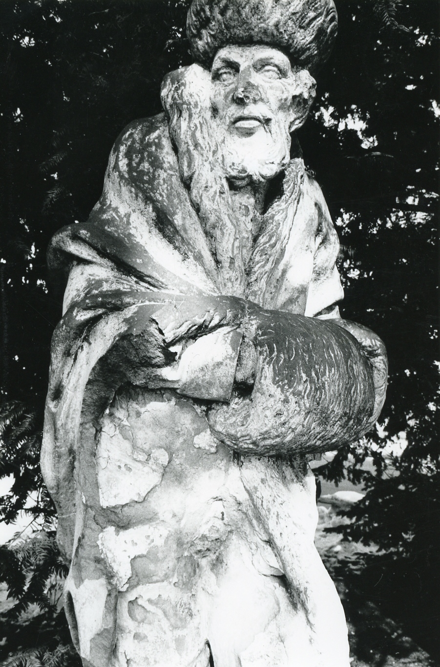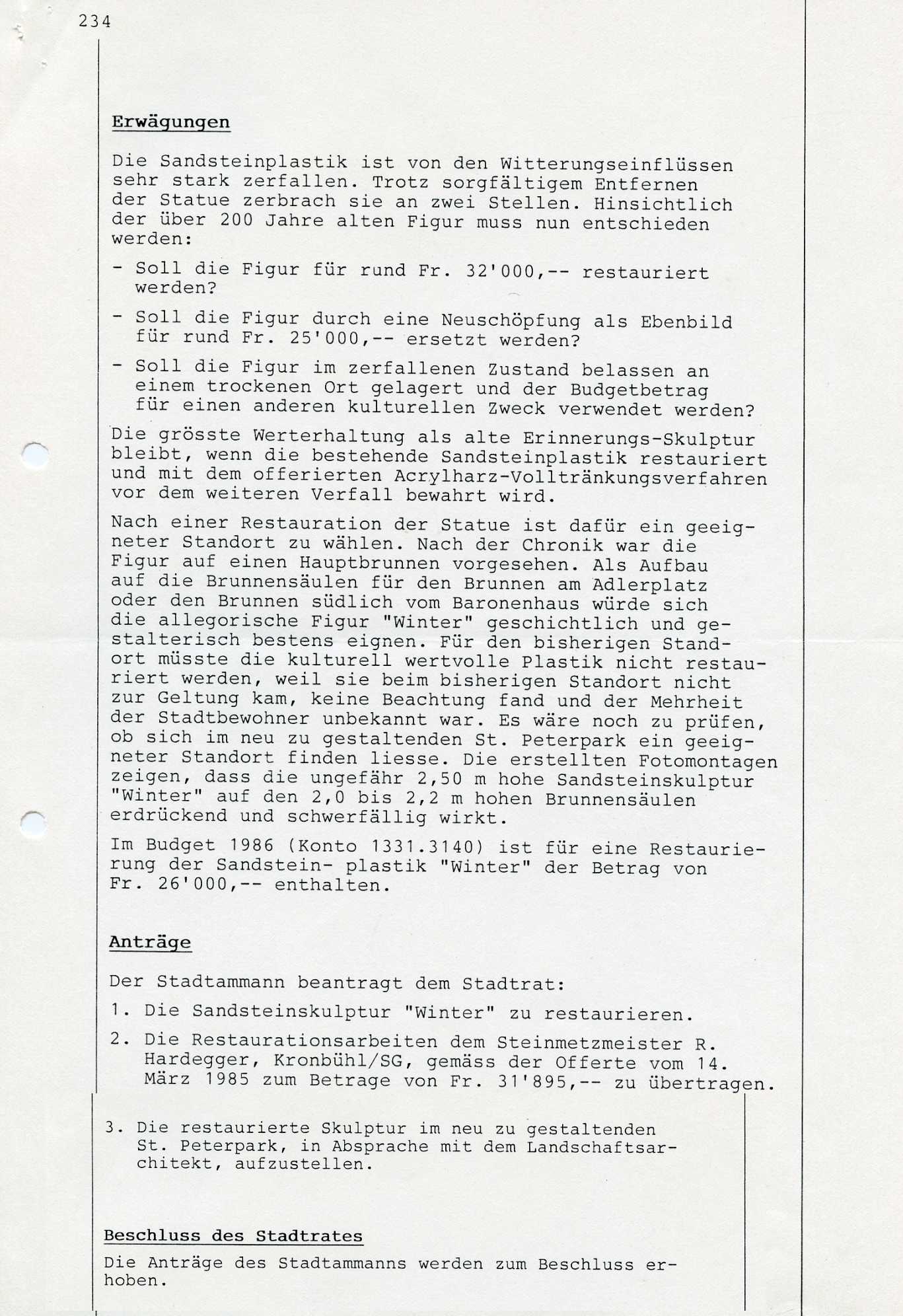"1779 wurde er beauftragt, vier allegorische Figuren der vier Jahreszeiten in Stein auf die Hauptbrunnen zu liefern. Ob aber diese grossen Statuen der Absicht entsprechend Verwendung fanden, ist sehr fraglich. Sie standen um die Mitte des 19. Jahrhunderts auf der Terrasse beim Hof und kamen später in den Kunsthandel. Nur noch der kaltanmutende Wintersmann ist im kleinen Park beim Bahnübergang an der Hubstrasse erhalten geblieben", so schrieb Karl Ehrat in seiner "Chronik von Wil" von 1958. Die Figur wurde im Laufe der Zeit schadhaft. Ab 1983 wurde eine Restauration ins Auge gefasst. Weil aber die Figur in einem so schlechten Zustand war, wurde 1986 davon Abstand genommen. Die Figur blieb im Werkhof, wo sie dann entsorgt wurde.