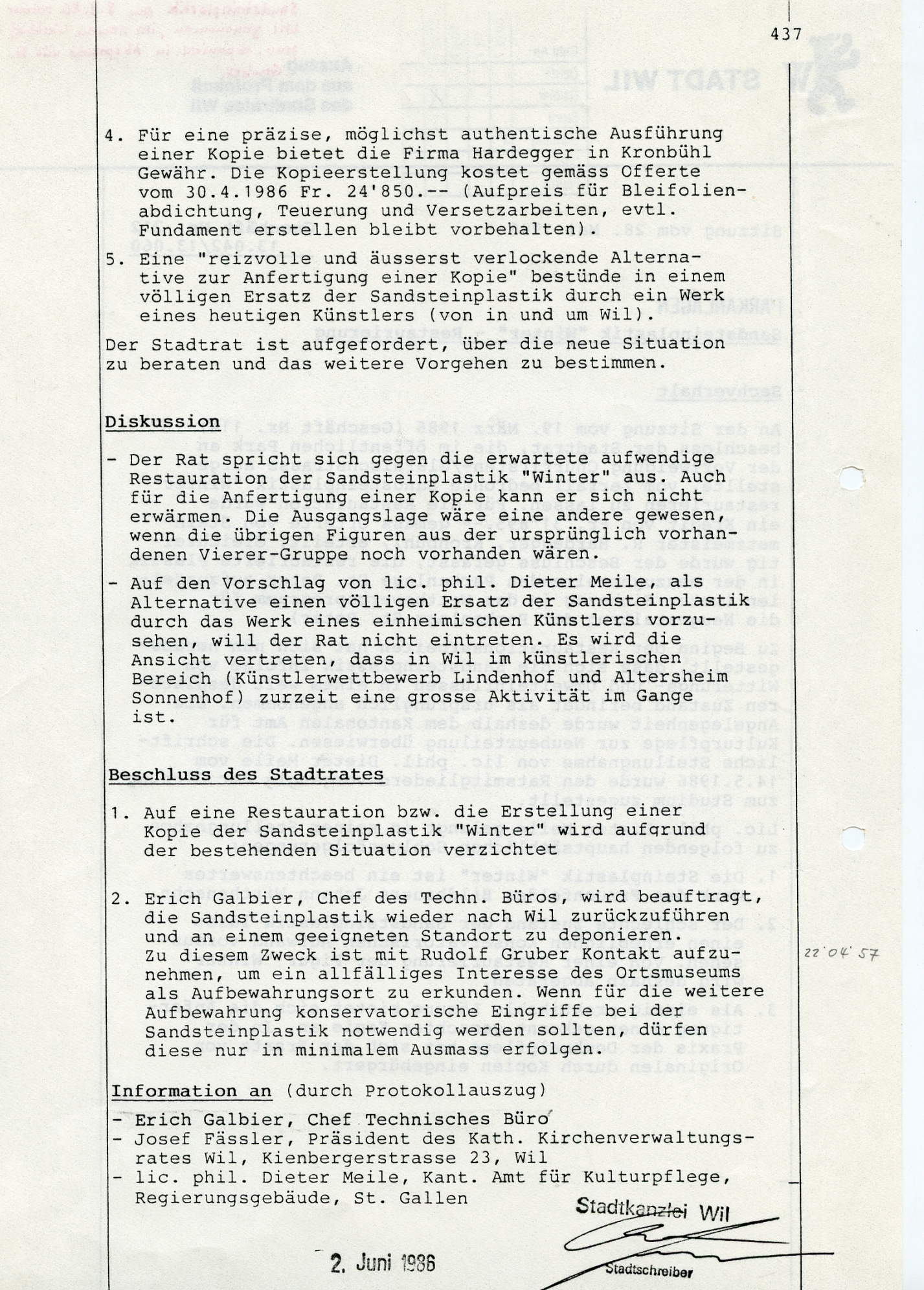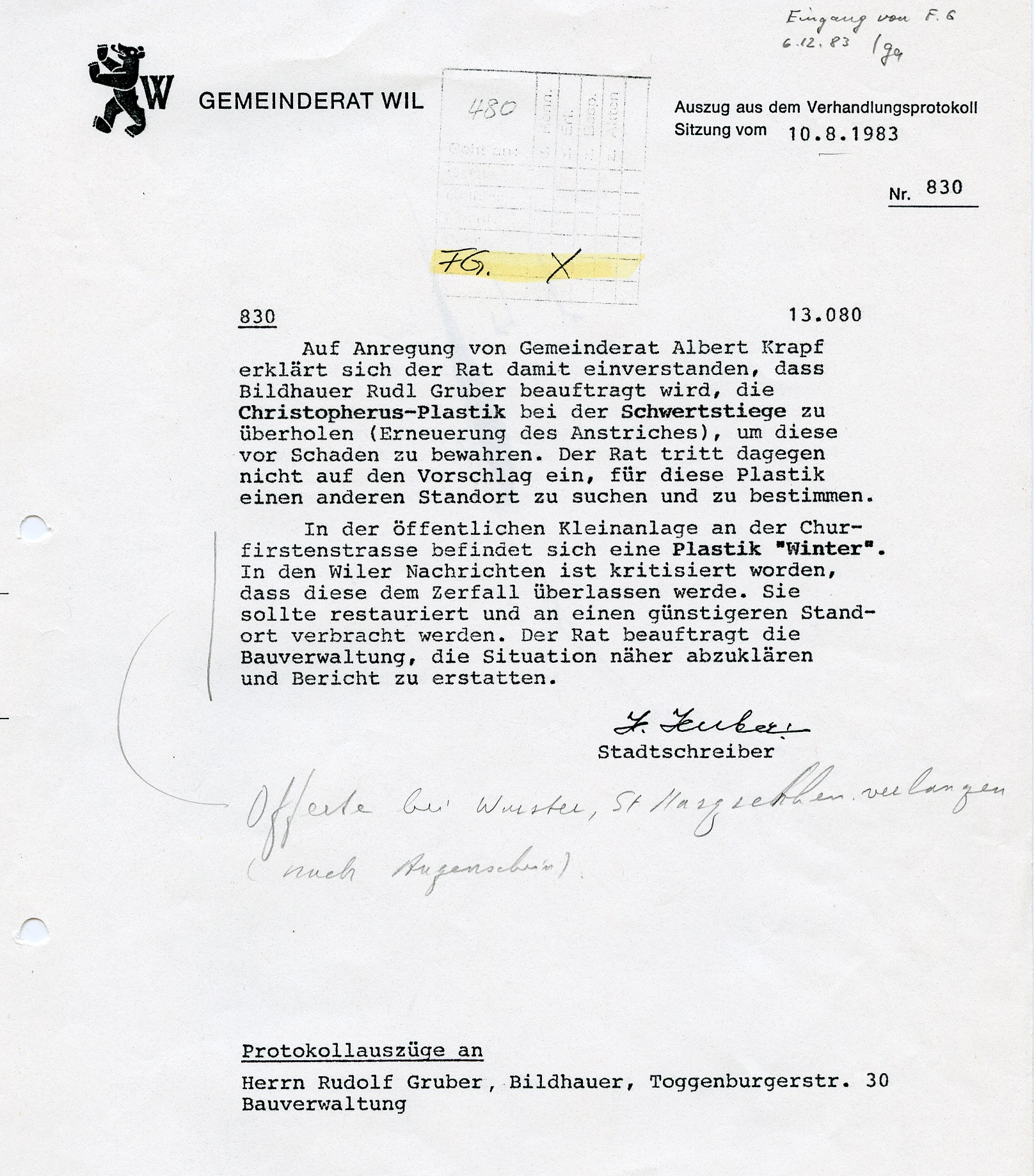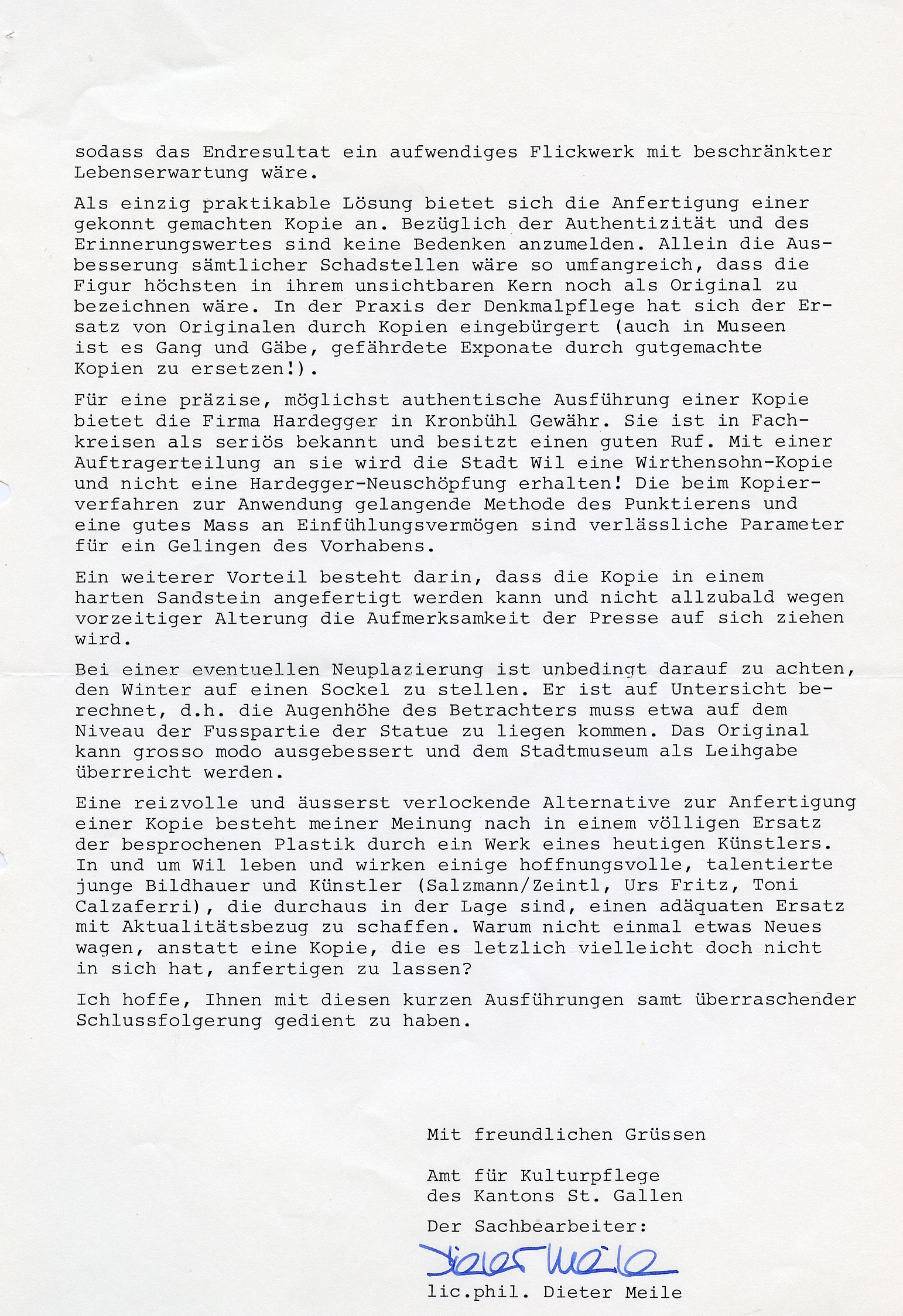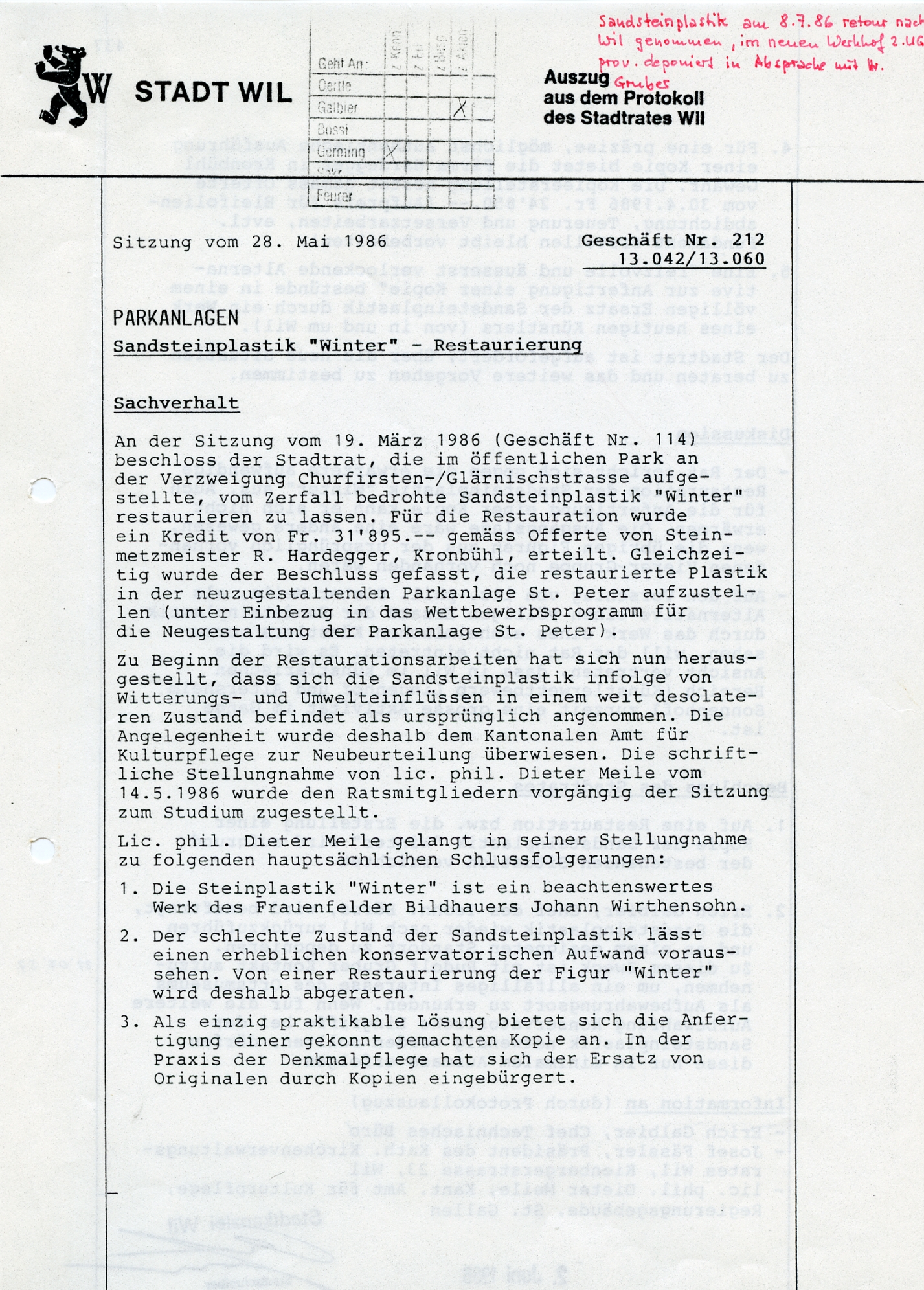 "1779 wurde er beauftragt, vier allegorische Figuren der vier Jahreszeiten in Stein auf die Hauptbrunnen zu liefern. Ob aber diese grossen Statuen der Absicht entsprechend Verwendung fanden, ist sehr fraglich. Sie standen um die Mitte des 19. Jahrhunderts auf der Terrasse beim Hof und kamen später in den Kunsthandel. Nur noch der kaltanmutende Wintersmann ist im kleinen Park beim Bahnübergang an der Hubstrasse erhalten geblieben", so schrieb Karl Ehrat in seiner "Chronik von Wil" von 1958. Die Figur wurde im Laufe der Zeit schadhaft. Ab 1983 wurde eine Restauration ins Auge gefasst. Weil aber die Figur in einem so schlechten Zustand war, wurde 1986 davon Abstand genommen. Die Figur blieb im Werkhof, wo sie dann entsorgt wurde.